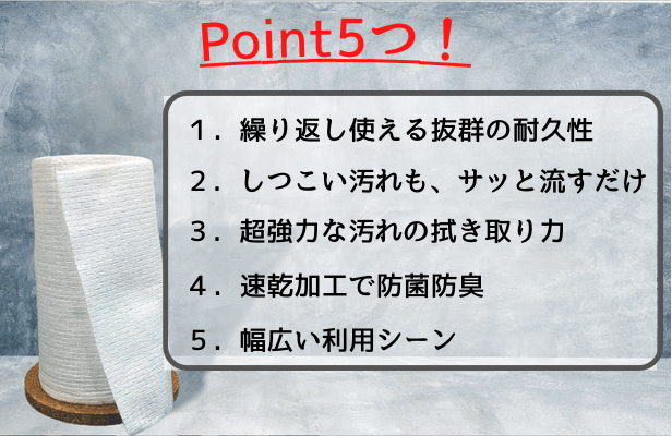 ■高圧水流によって繊維を交絡させる特殊な「スパンレース法」によって製造された高密度レーヨン繊維生地により水洗いでサッときれいに!