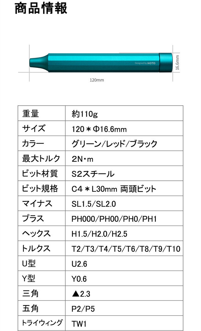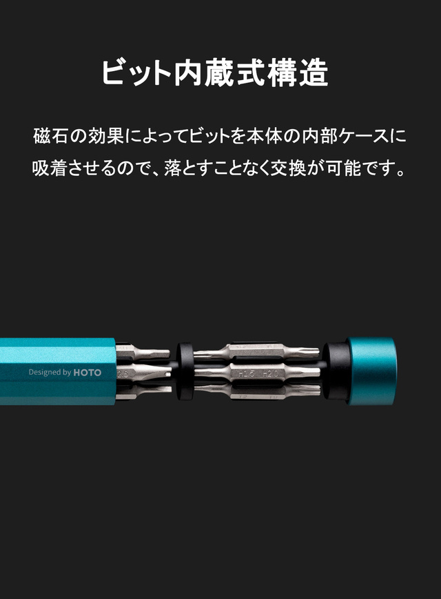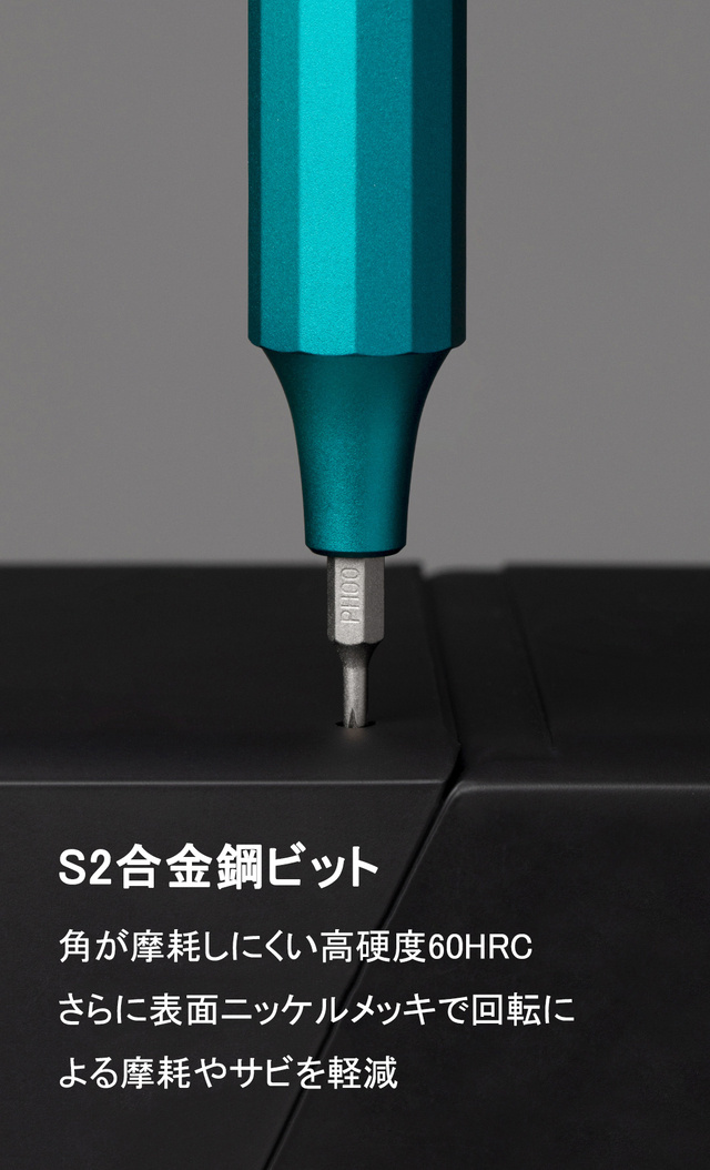 ハンドルはアルミニウム合金で作られ、滑り止め機能があり、防食性が高く、錆を防ぐことができます。また、ハンドルの形は人間工学設計で、滑りにくい上に、握り心地も気持ちいいです。回転は滑らかで使いやすさも抜群です。ビットとハンドルは磁石が内蔵され、逆転しても落としません。