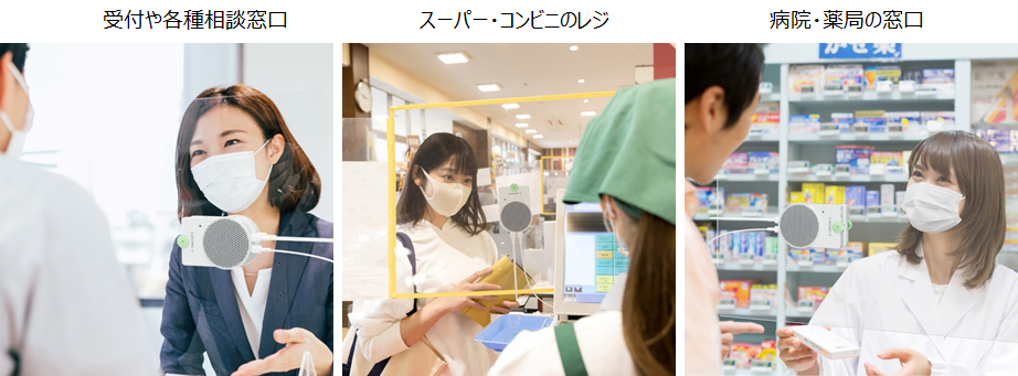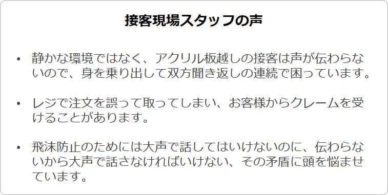 新型コロナウイルスの蔓延で、スーパーのレジや病院の受付等様々な場所で感染防止のビニールシートやアクリル板が人々を仕切り、マスクを着用して会話をすることが当たり前の光景となりました。お客様と接客スタッフの安全と引き換えに、お互いの声が「聞き取りづらい」ストレスが日常的に増えています。