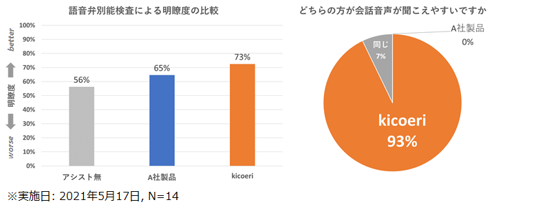 何も会話アシストが無い場合の明瞭度は56%「日常会話で内容を正確に理解できないことがしばしばある」状態でした。kicoeriを使うことで明瞭度が73%「普通の会話がほとんど理解可能なレベル」にまで大きく向上しました。比較のため他社(A社)の既存のパーティション取付型会話アシスト製品も評価したところ、明瞭度は kicoeri の方が上回っていました。また、実際の会話音声を聴き比べてみると93%の人が kicoeriの方が聞こえやすいと回答し、A社製品の方が聞こえやすいと回答した人は一人もいませんでした。
