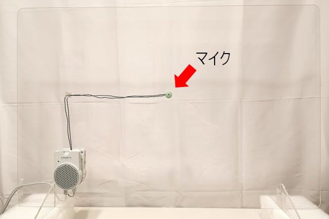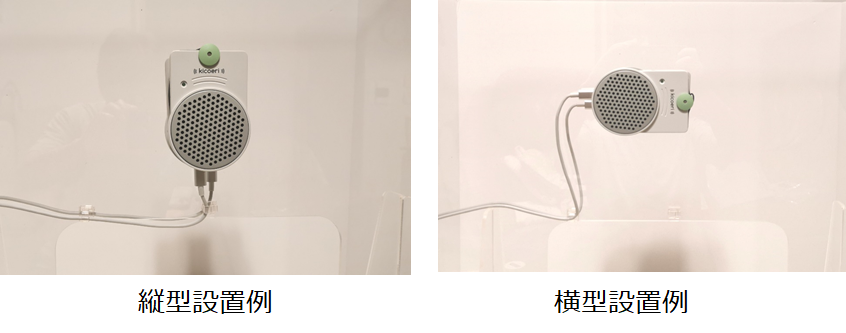 マイク(緑色部分)は本体から取り外してマイクケーブルを伸ばして使用することも可能です。マイク後面の磁石でパーティションを挟んで取り付けることができます。視界を遮りたくない場合には、マイクは口の正面近くに取り付け、親機・子機本体を左右や上下にずらして設置することができます。