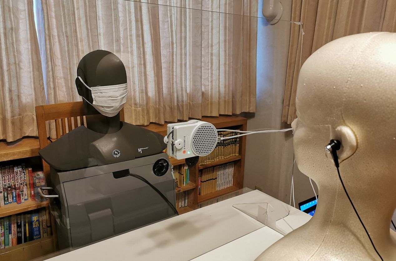 スーパーのレジ付近のがやがやしていて会話が聞き取りづらい環境を想定した聞き取り実験を行いました。耳鼻科などで聴力を測定する方法としても使用されている「語音弁別能検査」です。パーティションの向こう側の装置から再生される「ア」「メ」といった単音節を人が聞き取り、その正答率を明瞭度として評価します。それとは別に会話音声も再生して、文章としての聞こえやすさも主観評価してもらいました。