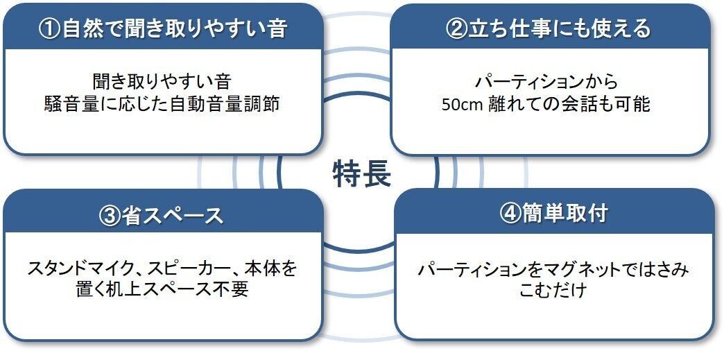 受付や各種相談窓口、スーパー・コンビニエンスストアのレジ、病院・薬局の窓口などでご利用いただけます。窓口以外にも、職場の会議室のパーティションでもご利用いただけます。パーティションにはさんで取り付けるだけの簡単設置で、別途机の上に機材を置くスペースは不要です。特別な操作は不要で、聞き取りづらかった会話が聞こえやすくなります。
