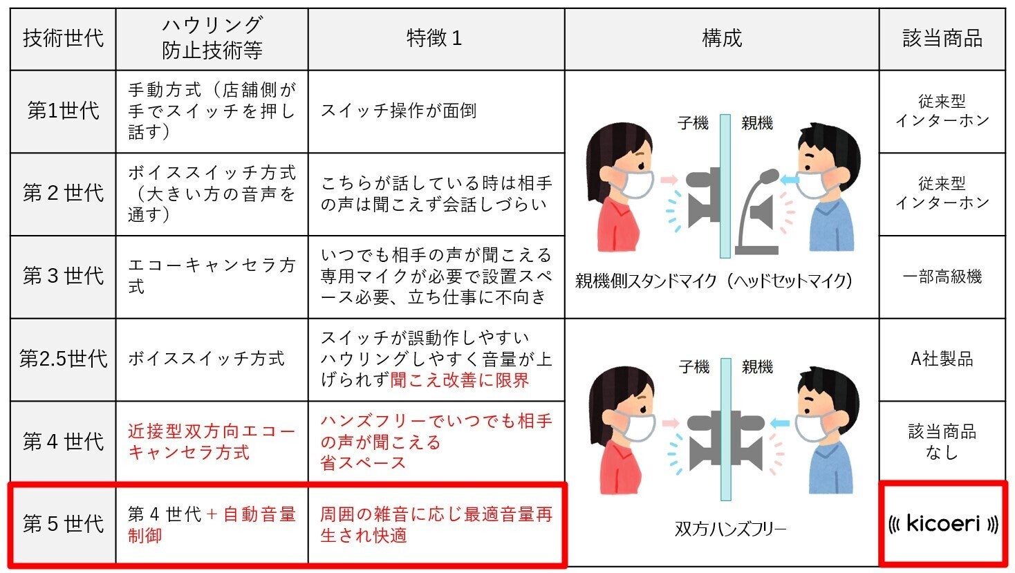 インターホンの技術世代を下表にまとめました。これまでに製品化されているインターホンは第1世代~第3世代のものです。少なくともスタッフ側の親機のマイクはスタンドマイクかヘッドセットマイクになっていて、口の近くにマイクがある必要がありました。また、スタッフが話す時だけボタンを押す(手動スイッチ)とか、お客様とスタッフの声が大きい方のマイクだけをONにする(ボイススイッチ)ことで、自分のマイクに自分の声以外の音が入ることを極力防ぎ、ハウリングが起きないようにしています。