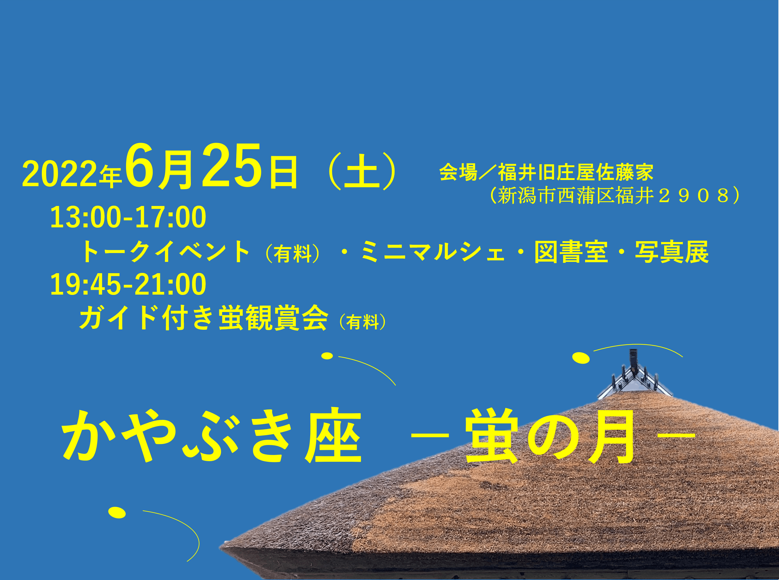 2022/06/16 13:50かやぶき佐藤家のクラファン支援者のみなさまご無沙汰しています。多くのみなさまよりご支援いただき実施してた佐藤家の茅葺屋根の葺き替え工事が無事に終了しました。2018年から足掛け4年かけてようやく全面補修をすることができました。これで十数年は大丈夫です!さて、佐藤家のある新潟県新潟市西蒲区の福井集落はこの6月はホタルが飛び交う場所です。今年も新型コロナウイルスの影響で「ほたる祭り」という住民が屋台を出すお祭りが中止となってしまいました。が、せっかくの機会ですので佐藤家でトークやマルシェ、ホタル鑑賞などをセットにしたイベント「かやぶき座」を企画しましたのでご案内致します。トークショウはオンライン配信も予定しています。この機会にぜひご参加いただければ幸いです。「かやぶき座」は、新潟市西蒲区福井にある茅葺屋根の古民家・佐藤家に集う人たちが企画する古民家開きの催しです。今回は蛍の季節に合わせて企画しました。佐藤家や福井集落でのんびりゆっくり過ごしてください。主催:NPO法人佐藤家保存会・家守の会日時:6月25日(土) トーク&ミニマルシェ&ライブラリー&ギャラリー13:00~17:00 蛍観賞会19:45〜21:00場所:福井旧庄屋佐藤家(新潟市西蒲区福井2908)//////マルシェ&ライブラリー&ギャラリー//////時間▶13:00~17:00入場▶無料●ミニマルシェ 地元で採れた野菜やお米、選りすぐりの本、リユース品に、峰乃白梅酒造の試飲が並ぶ小さなマルシェ!今回のかやぶき座ならではの出店で掘り出し物やおもしろい出会いがあるかも(^O^)/●屋根葺き替え&村の昔 写真展足掛け4年、今年5月ついに葺き替え工事を終えた茅葺屋根の完成を祝って、20~90代の茅葺職人さんたちによる屋根仕事を写真で伝えます。また、福井集落の古写真も展示。●佐藤家の図書室手作り本箱に貸主おすすめの本が並びます。佐藤家周辺で本を片手にゆっくりどうぞ。当日返却をお願いします。.//////トークイベント(オンライン配信有)//////参加費▶各トーク500円、1日券1,000円 定員▶20名 事前申込▶要 下記URLからお申し込みをお願いします。https://forms.gle/LqanRND75P6AY1YE7オンライン配信▶各トークあり①13:30~14:30\葺替完成報告/「かやぶき佐藤家のこれから。Ⅱ」大﨑悠(茅葺職人) × 唐澤頼充(佐藤家保存会)1998年に保存活動がはじまった江戸時代に建てられた茅葺屋根の古民家・佐藤家。2018年からスタートした茅葺屋根の葺き替え工事が無事終わりました。総費用は約800万円。寄付や、材料のカヤ集めなどのボランティアなど多くの皆様から支えてもらいました。佐藤家のこれまでや、葺替工事の様子を写真で振り返りつつ、佐藤家のこれからについて、茅葺職人の大﨑さんをお招きして語らいます。②14:50~15:50 \発刊記念トーク/「いま関係人口をとらえなおす。~都会の若者たちは、地域で何を感じたのか?~」井上有紀(にいがたイナカレッジ)×唐澤頼充(佐藤家保存会)地域の人口減に歯止めをかけて、日本全体の活力をあげようとスタートした「地方創生」。その取り組みのキーとなっているのが、地域の外からかかわる人を指した「関係人口」です。今、全国各地で関係人口づくりのさまざまな成功や失敗事例が生まれています。そんな中、若者と地域をつなぐプログラムを多数手がけてきた「にいがたイナカレッジ」が関係人口を問い直すをテーマに冊子を発行しました。執筆者である井上有紀さんをお招きし、そのエッセンスについてお聞きします。「心と身体の旅をする~若者たちが地域・農村との関わりで得られるものとその機会づくり~」を無料配布します!③16:10~16:40\試飲あり!/「福井の里の水の恵み。水と酒づくりの話」佐藤元(峰乃白梅酒造・蔵人)ここ福井の里にある酒蔵・峰乃白梅酒造は1636年に藩主に酒を献上した記録の残る歴史ある酒蔵。かつて越乃寒梅、雪中梅とともに「越乃三梅」として地酒ブームを牽引しました。2015年に経営が代わり、新しい杜氏を迎え、新しい日本酒づくりに邁進しています。酒は土地の水で仕込むもの。今回は蔵人の佐藤さんから「水」をキーワードにこの地の自然環境や歴史、そして酒づくりについてお話しいただきます。お話の後には利き酒タイムもあり!会場内ではお酒の試飲コーナーも設置します。//////蛍観賞会//////参加費▶500円、トーク兼用1日券1,000円定員▶30名 事前申込▶要 下記URLからお申し込みをお願いします。https://forms.gle/LqanRND75P6AY1YE719:45~(1時間程度を予定)\ガイド付き蛍観賞/「今夜がピーク!?地域のガイドさんと歩く福井の蛍観賞会」ガイド 平岡明(ほたるの会)◎各トークと蛍観賞会共に、下記URLから事前申込をお願いします。https://forms.gle/LqanRND75P6AY1YE7◎マスクの着用と手指消毒をお願いします。◎今回のかやぶき座では飲食の提供はありません。 もっと見る