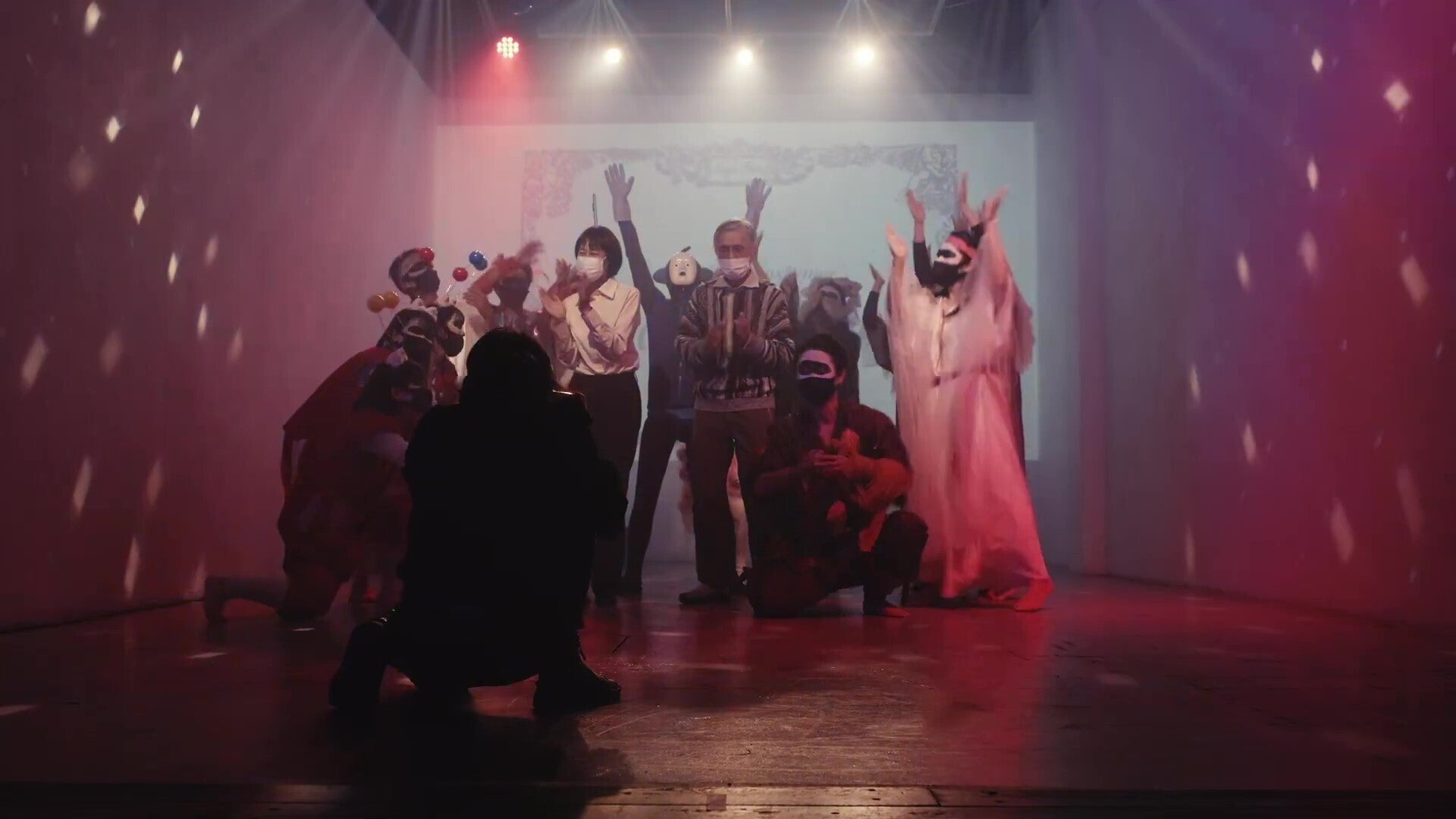 2020年10月には、文化庁の文化芸術活動継続支援事業の助成金を得て、東京・木場のスタジオで、今回の魔笛公演のために用意した衣装を使った「コロナ退散祈願 魔笛ファッションショー」を実行しました。コロナへの抵抗を込めて、出演者全員が黒マスクに黒い眼の縁取りをしての登場です。