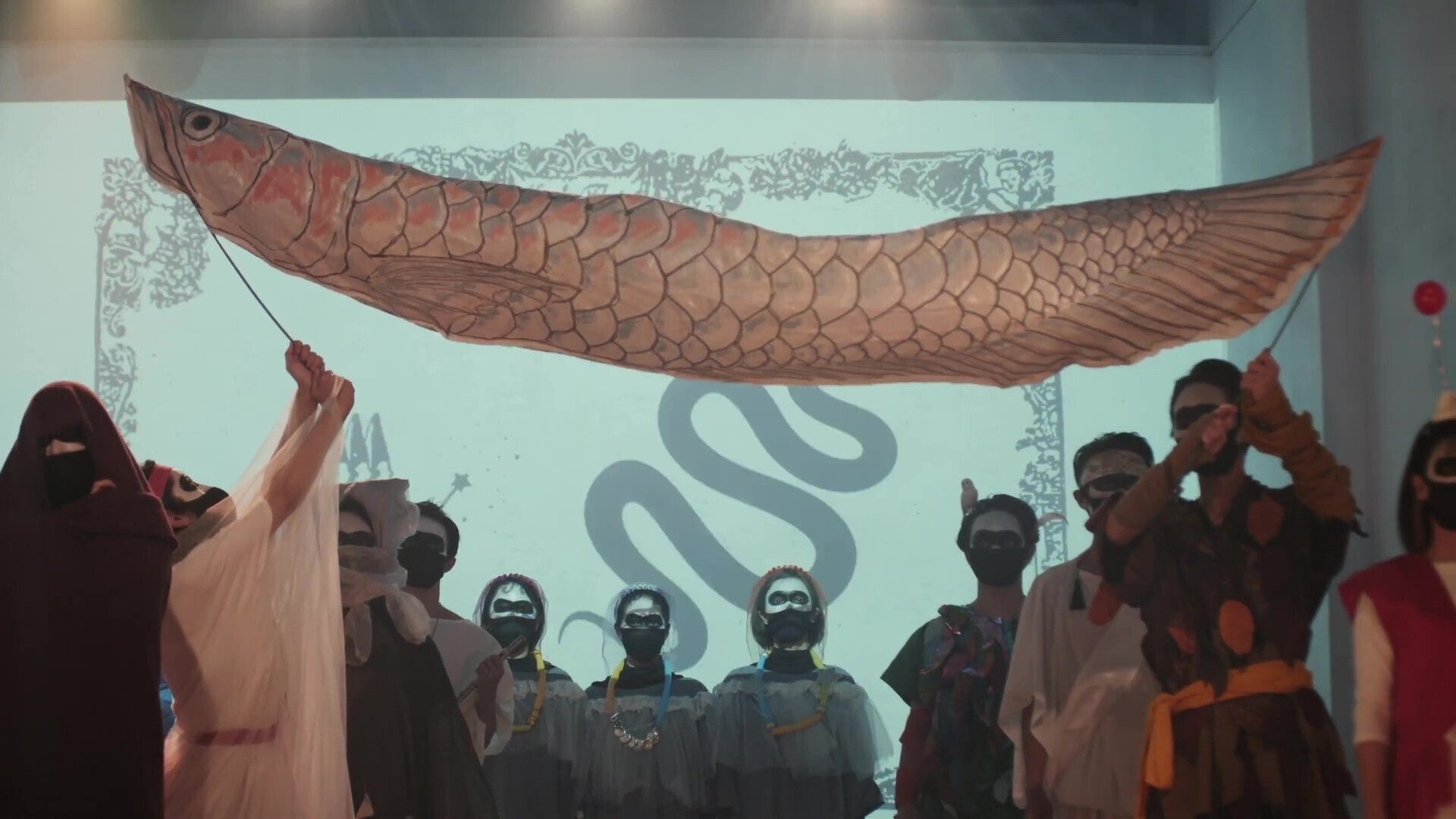古代魚アロ ワナを題材とした作品「煌めき」で日展特選に輝いた日本画家の川田恭子さんが衣装をデザインし、和のテイストの独特の衣装が舞台で躍動、魔笛冒頭に怪魚アロワナのぼりも登場します。