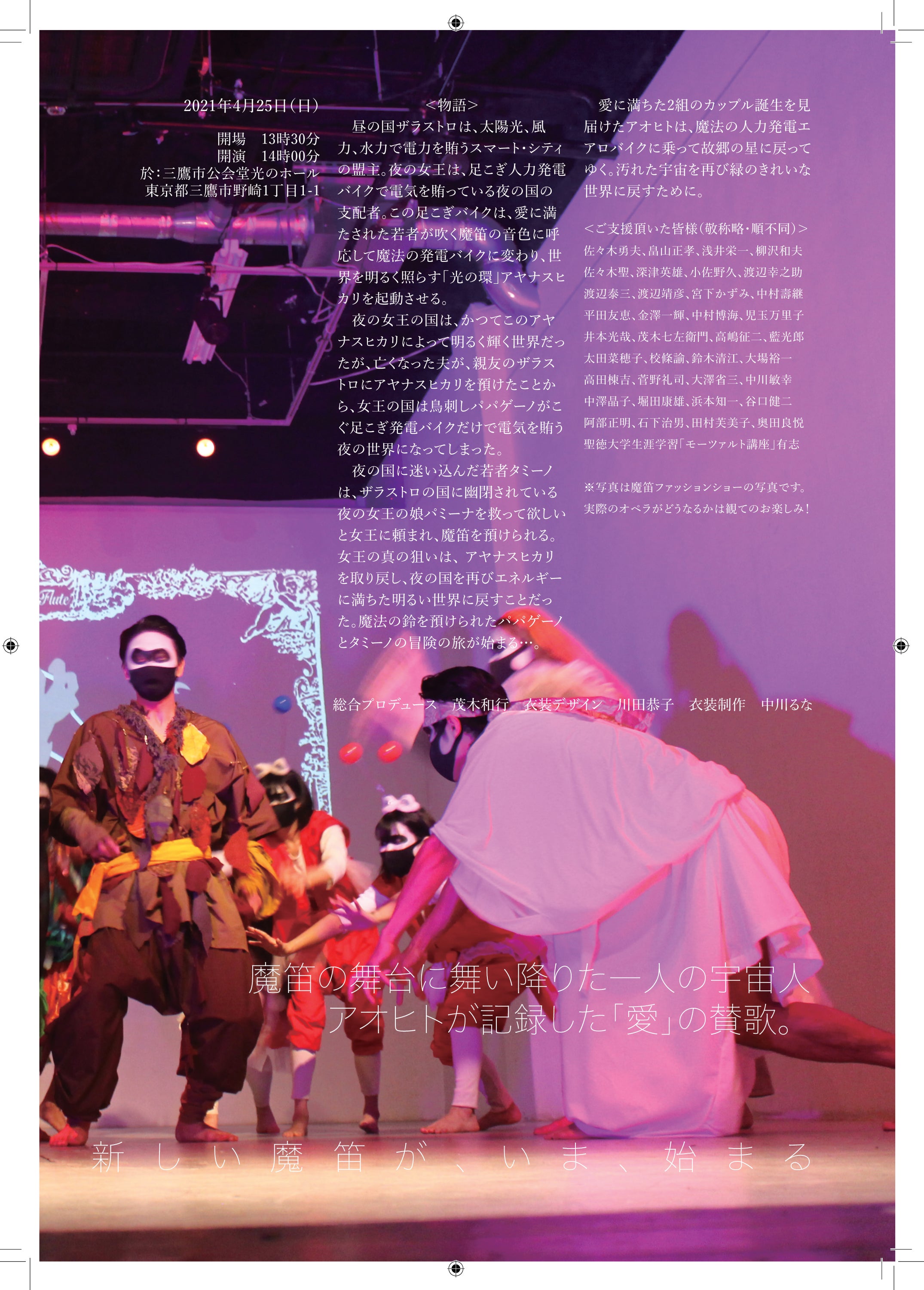 昼の国ザラストロは、太陽光、風力、水力で電力を賄うスマート・シティの盟主。夜の女王は、足こぎ人力発電バイクで電気を賄う夜の国の支配者。愛に満ちた若者が吹く魔笛の音色に呼応して魔法の乗り物に変わる人力発電バイクが光の環「アヤナスヒカリ」を起動し、世界をクリーンなエネルギーで満たしていくーこんな私たちの新解釈「魔笛」は、舞台に舞い降りた宇宙人アオヒトが、手持ちのスマホで記録し、故郷いろいろ銀河のあおいろ星の住人に、「愛」が宇宙もきれいにする力であることを伝えて行きます。  サステナブルとSGDsの言葉が躍る現代社会ですが、私たち「地球人」は地球をきれいにすることばかりに心を奪われて、宇宙を汚していっていることに、あまり目を向けていないのではないでしょうか。私たちが、月から火星へ、そして太陽系から私たちの銀河系をも飛び出し、お隣のアンドロメダ銀河へ、さらにいずれは宇宙の深奥にまで進出していくことは目に見えているのではないでしょうか。