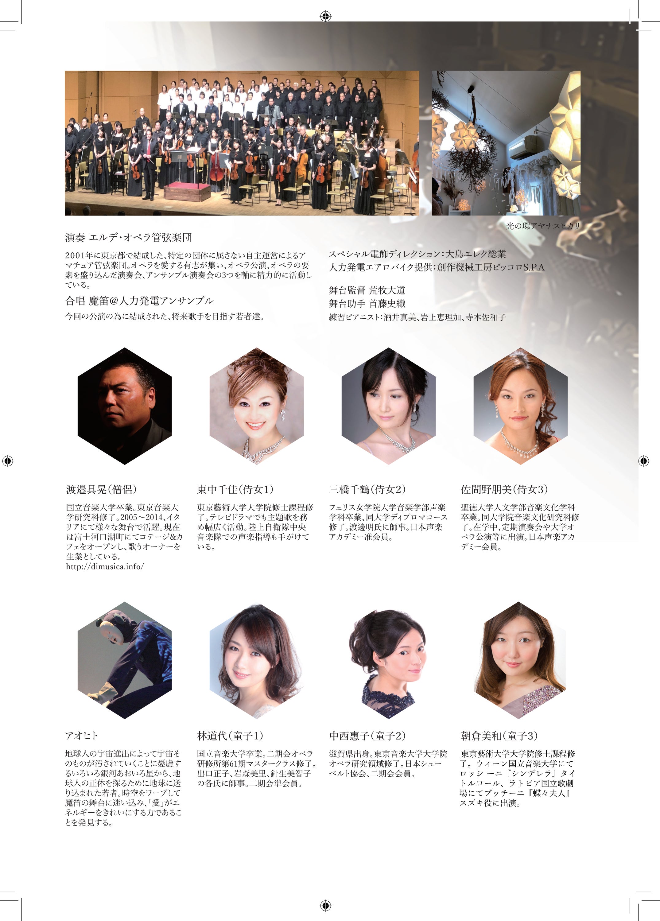 「パパゲーノの冒険~持続可能な愛と平和を求めて」 で登場する歌手陣は、今回ご支援をお願いしている公演「魔笛と魔法の人力発電エアロバイク」にほぼそのまま出演いたします。