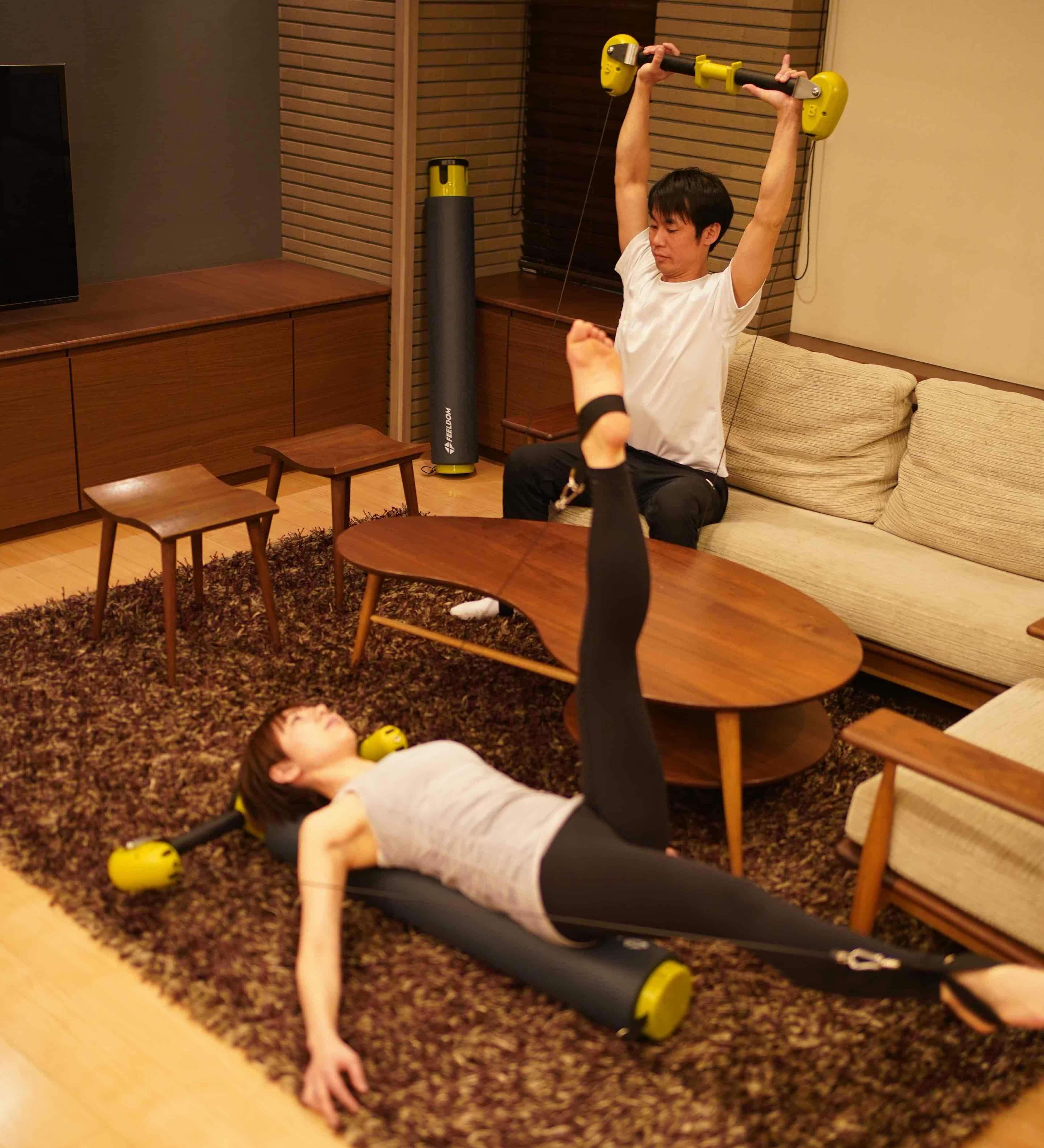 FEELDOM CORE-T POLEは自宅で楽しくトレーニングやピラティスが行えるアイテムです。使い方が多様であるからこそ飽きずに継続して運動習慣をライフスタイルに取り入れることができます。