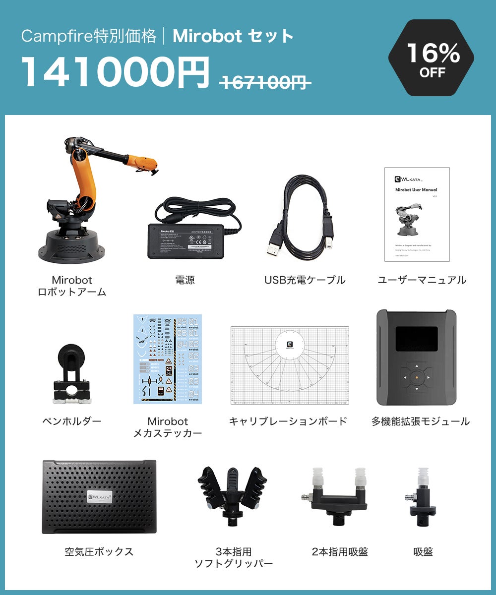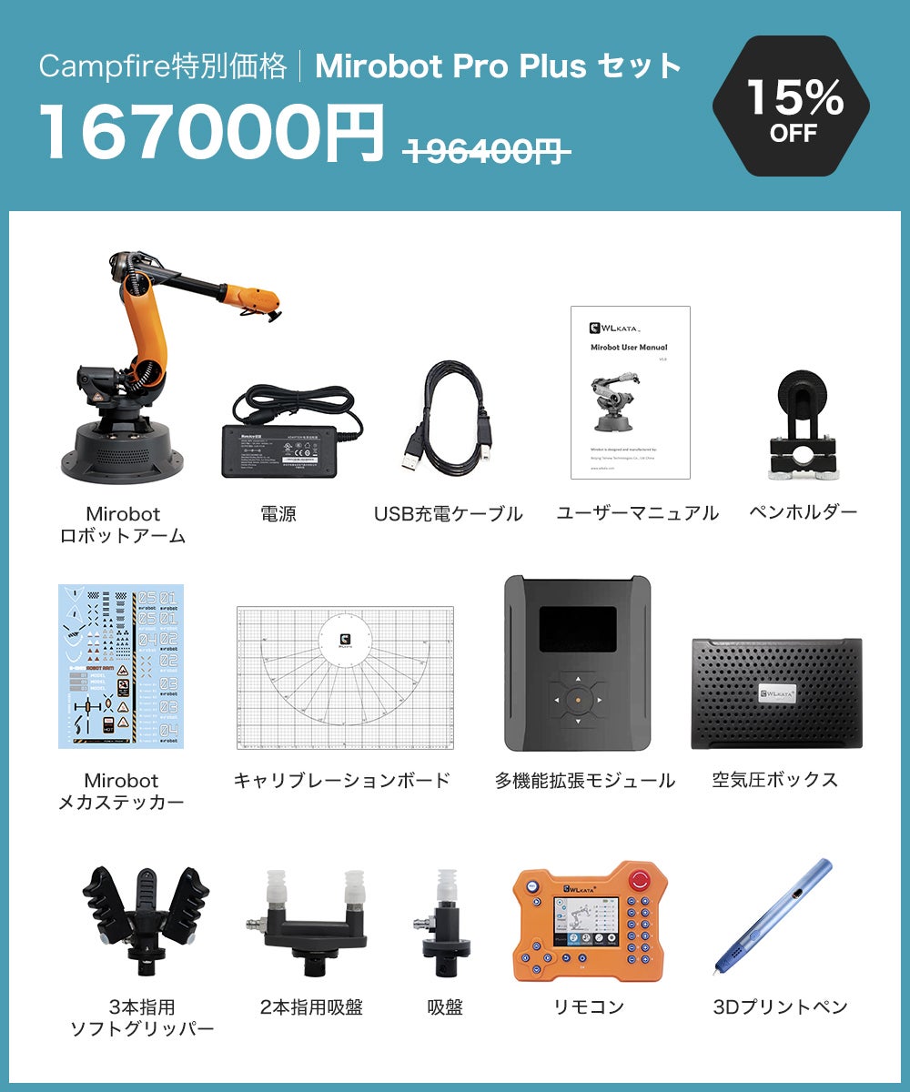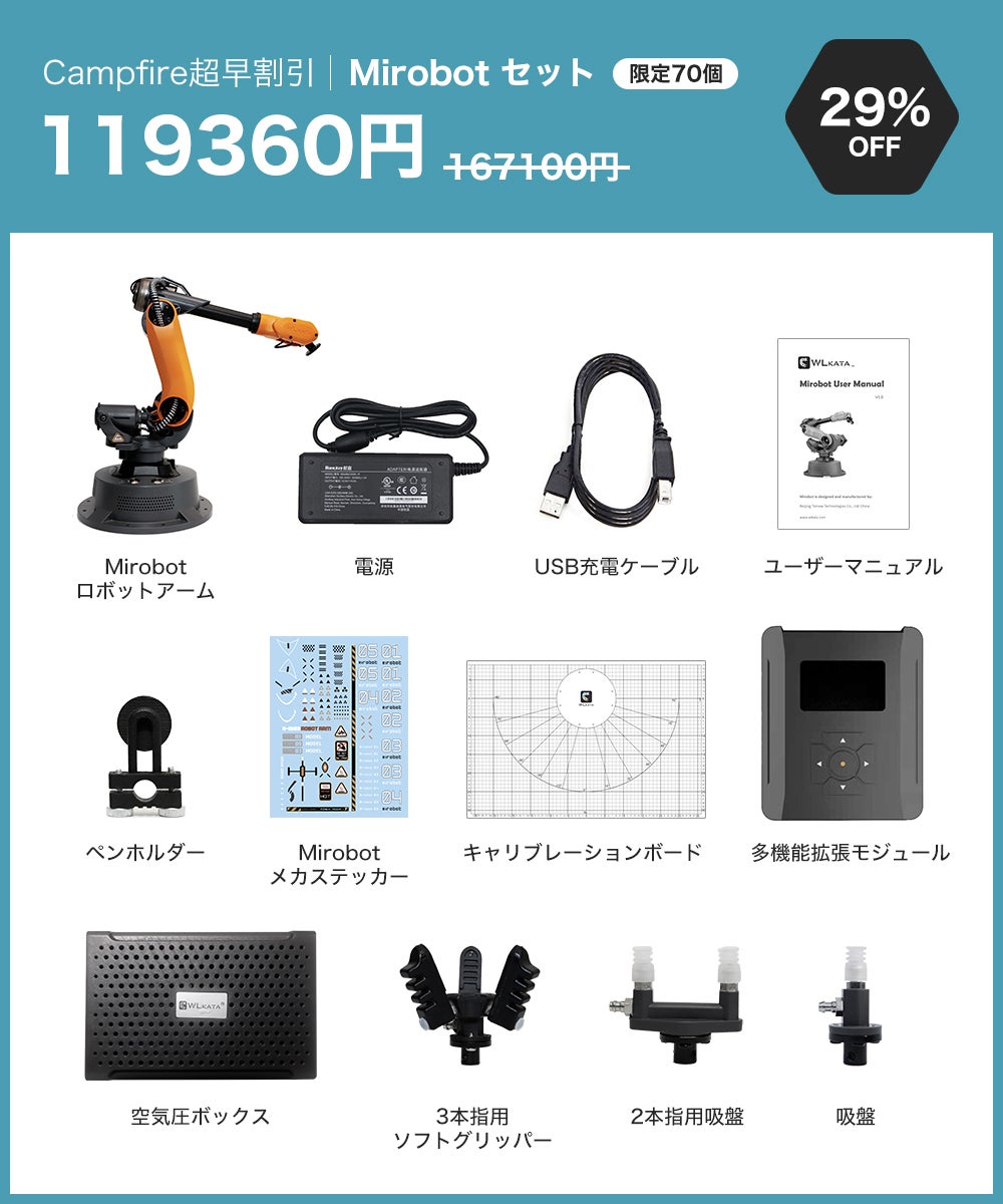 2021/04/29 12:09支援者の皆様、皆様のご支援とのおかげさまで、公開日に目標金額を100%達成いたしました。私たちのコミュニティの一員として、Mirobotを実現していただきありがとうございます。Mirobotの生産に向けて最善の努力を払い、皆様にタイムリーにお届けします。この度、ご支援いただいた皆様には、プロ向けの実験マニュアルをデジタル版の特典として無料でお送りいたします。マニュアルには、Mirobotを実験や日常生活でよりよく使用するための専門技術(Robotics, ROS)や基礎知識(Blockly, Python)が記載されています。マニュアルは3種類あり、キャンペーン終了後にご希望をメールで回収させていただきます。 種類は以下の通りとなります。1.ロボット工学 計画、制御、応用この実験ハンドブックは、ロボット工学を専攻している上級の学部生や大学院生、また、ロボット工学の研究開発に従事している方の参考書として適しております。2. ROSによるロボット開発WLKATAでは、Mirobot(6軸産業用ロボットアーム)を制御するためのROSソフトウェアパッケージを提供しています。このハンドブックでは、Moveit!, RViz, WLKATA Mirobotとのシリアル通信に対応したROSソフトウェアパッケージのインストールと使用方法について説明しております。3. WLKATA Mirobotの基礎知識Programming and Control プログラミングと制御Mirobotのプログラミングと制御マニュアルの基礎は、ロボットアームの認知、WLKATAスタジオソフトウェアのプログラミング(Blockly+Python)、OpenCVの使用に基づいており、ロボットアームの使用方法を示しています。お友達やご家族、Facebookやtwitterなどでのキャンペーンシェアにご協力お願い申し上げます。一緒にコミュニティを大きくしていきましょう!宜しくお願い致します。WLKATA Team もっと見る