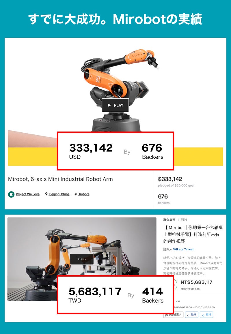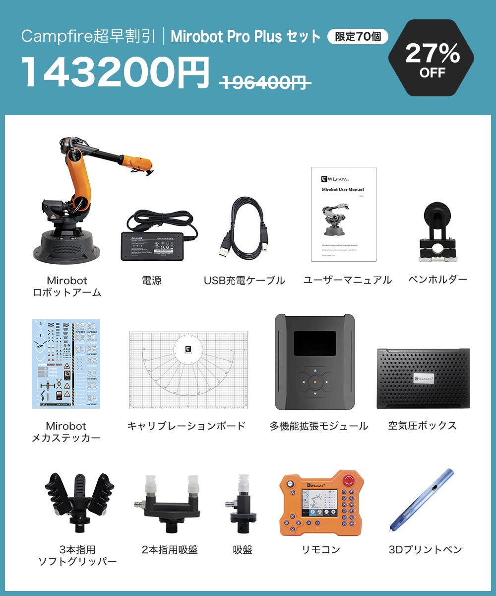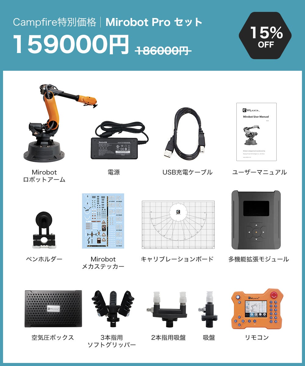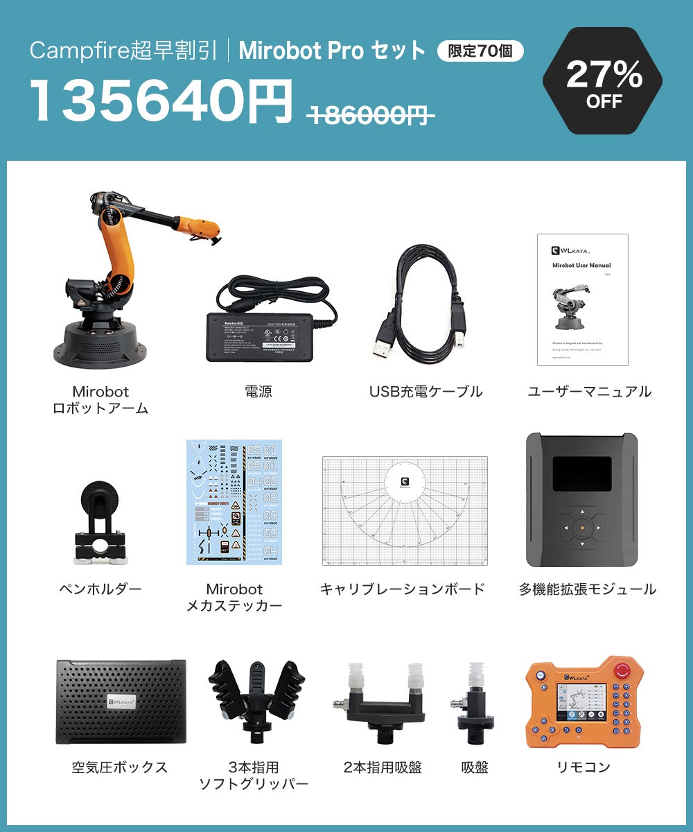 2021/04/29 12:09支援者の皆様、皆様のご支援とのおかげさまで、公開日に目標金額を100%達成いたしました。私たちのコミュニティの一員として、Mirobotを実現していただきありがとうございます。Mirobotの生産に向けて最善の努力を払い、皆様にタイムリーにお届けします。この度、ご支援いただいた皆様には、プロ向けの実験マニュアルをデジタル版の特典として無料でお送りいたします。マニュアルには、Mirobotを実験や日常生活でよりよく使用するための専門技術(Robotics, ROS)や基礎知識(Blockly, Python)が記載されています。マニュアルは3種類あり、キャンペーン終了後にご希望をメールで回収させていただきます。 種類は以下の通りとなります。1.ロボット工学 計画、制御、応用この実験ハンドブックは、ロボット工学を専攻している上級の学部生や大学院生、また、ロボット工学の研究開発に従事している方の参考書として適しております。2. ROSによるロボット開発WLKATAでは、Mirobot(6軸産業用ロボットアーム)を制御するためのROSソフトウェアパッケージを提供しています。このハンドブックでは、Moveit!, RViz, WLKATA Mirobotとのシリアル通信に対応したROSソフトウェアパッケージのインストールと使用方法について説明しております。3. WLKATA Mirobotの基礎知識Programming and Control プログラミングと制御Mirobotのプログラミングと制御マニュアルの基礎は、ロボットアームの認知、WLKATAスタジオソフトウェアのプログラミング(Blockly+Python)、OpenCVの使用に基づいており、ロボットアームの使用方法を示しています。お友達やご家族、Facebookやtwitterなどでのキャンペーンシェアにご協力お願い申し上げます。一緒にコミュニティを大きくしていきましょう!宜しくお願い致します。WLKATA Team もっと見る