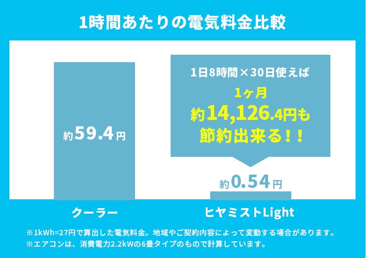 さらに電気代も、クーラーに比べ圧倒的に抑えることができ、家計は大助かりのはず。