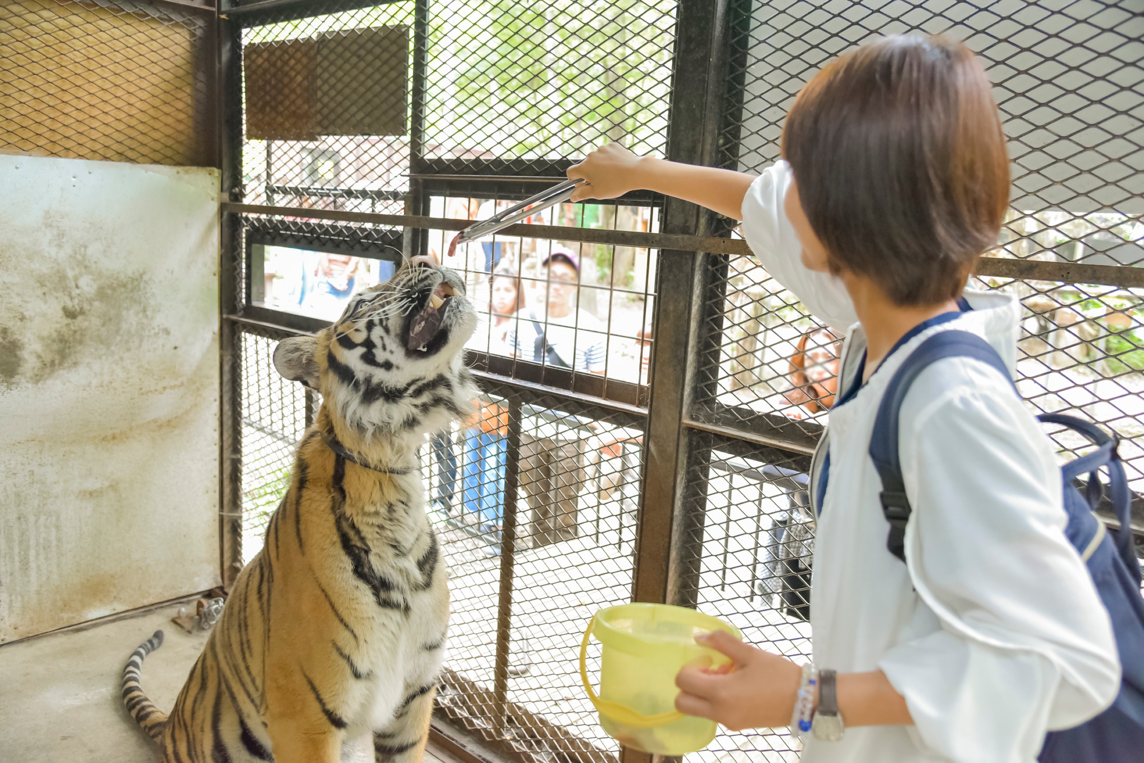 お客様は柵の上の通路から、すぐ近くでライオンを見たり、エサをあげられる構造にします。