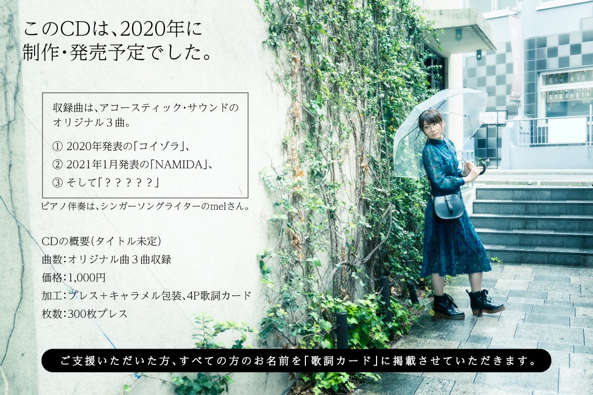 2021/05/12 16:34【御礼】4/10~5/10までの約一か月間にわたるクラウドファンディングの募集期間が終了いたしました。この間、皆様から多大なご支援をいただきましたことを厚く御礼申し上げます。本プロジェクトはなんと、開始後9分強で目標の100%を突破しておりました。最終的にご提供いただきました資金総額は457,000円となります。ここからキャンプファイヤーや振り込みに係る手数料を差し引いた406,730円をCD制作および、MV2本の制作並びにディスク等でのご提供にあてさせていただきたいと存じます。よりよい成果物をなるべく早くお届けできるよう、努力してまいりますので、引き続きよろしくお願い申し上げます。【今後】現在、追加のリターンを含めた実施計画を策定中です。近日中に、皆様に詳細なご連絡を入れさせていただきますので、今しばらくお待ちくださいませ。 もっと見る