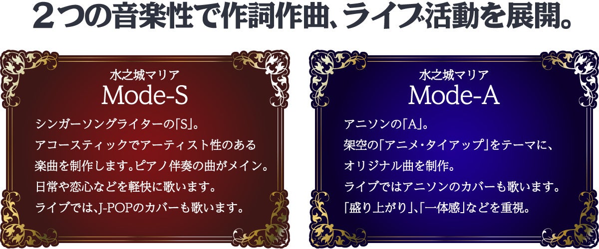出演するライブに合わせ、「Mode-S」「Mode-A」という2つの音楽性を使い分け、都内を中心にライブ活動を展開。それぞれのModeでオリジナル曲を作詞作曲しています。