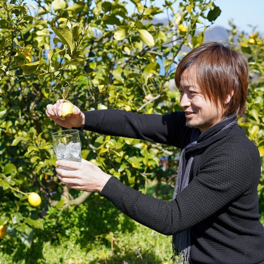 鹿山さんは、いつも使っているレモンの農園を実際に見てみたいと、『citrusfarms たてみち屋』を訪ねました。おもむろに、もぎたてのレモンでレモンサワーを作った鹿山さんは、一口味わって「ここのレモンは、やっぱり香りのフレッシュさが違う。そしてしっかり熟しているから、味わいがまろやか。最高のレモンサワーに仕上がります」と話します。