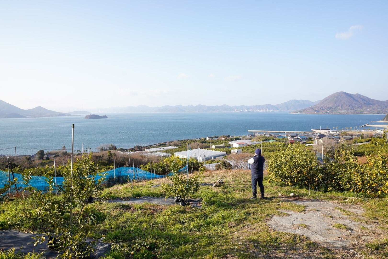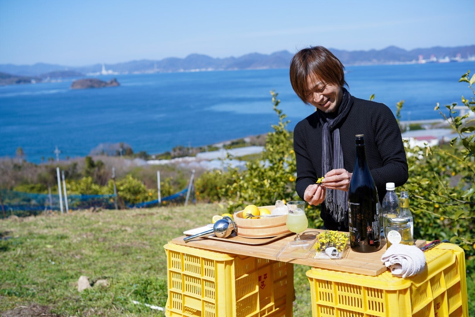 瀬戸内海を見渡せる畑で、レモンを使ったカクテルを振舞ってくれた鹿山さん。