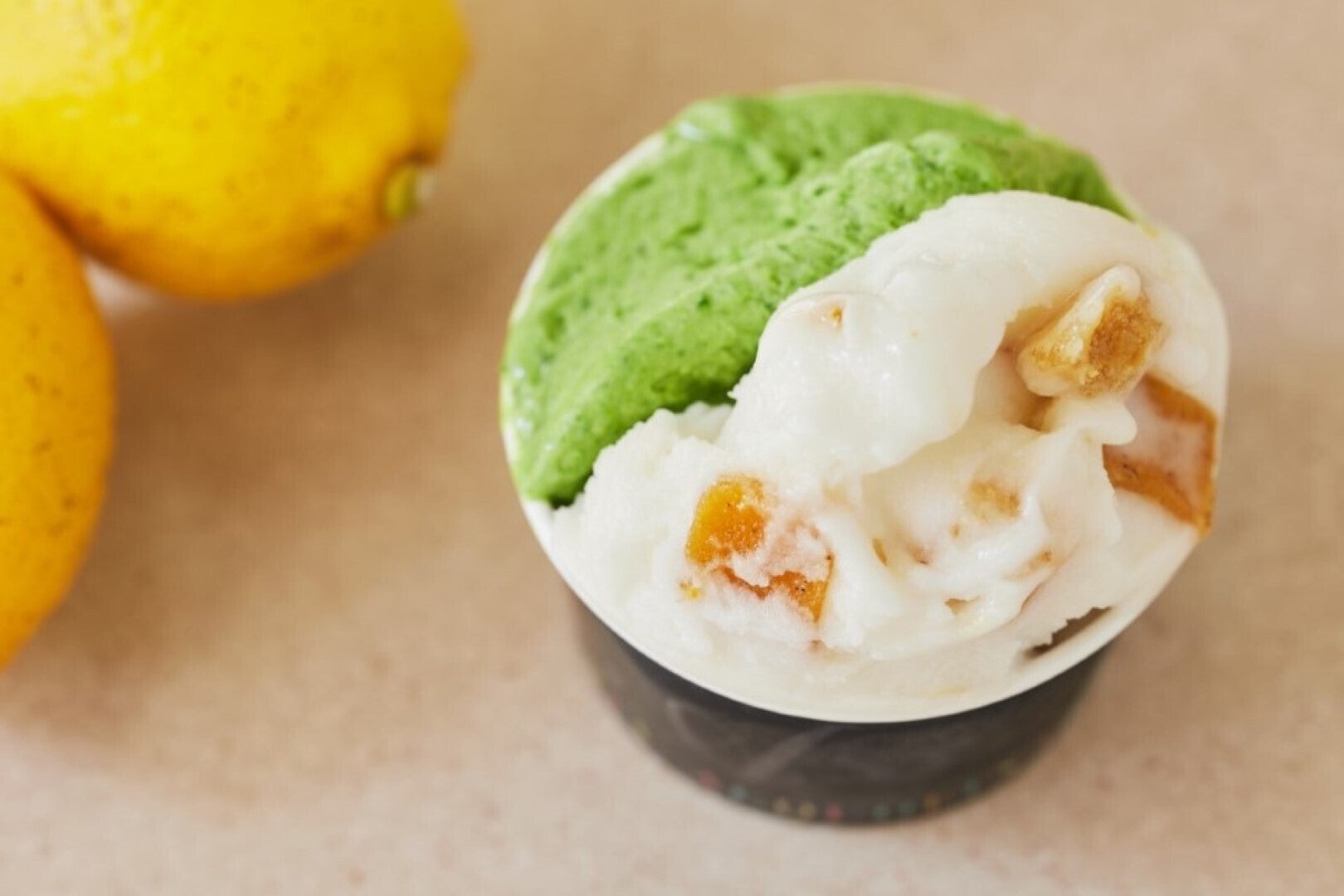 「citrusfarms たてみち屋」を余すところなく使った「KANさんのレモン 」と、春を感じる「菜の花とハチミツ」。「レモンクリームのジェラートは乳製品の性質上、果汁を加えすぎることはできません。でも『citrusfarms たてみち屋』のレモンだと、少ない果汁でも酸味だけでなくしっかりとレモン本来の風味が加わります。レモンとしての味が強く、バランスがいいからでしょうね。他のレモンの場合、皮の白い部分は苦みだけでなく雑味が立ってしまうことも多いけど、このレモンなら白い部分を使っても苦味が穏やかで、むしろそれが旨みになってくれる。丸ごと全部使いたいと思わせてくれるレモンなんです」