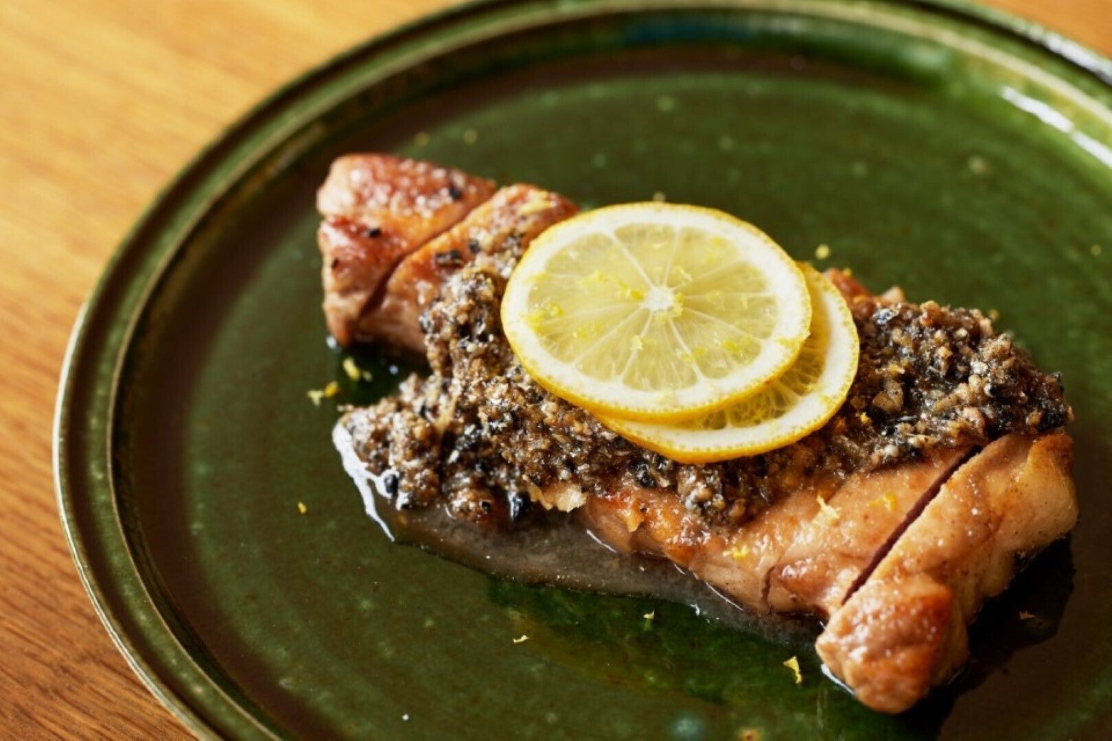 生姜と共にグリルした豚肉に、レモン果汁をたっぷりかける。タレもトッピングも、まさにレモンづくしの一品。