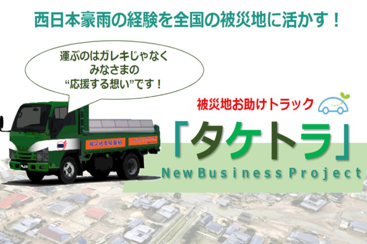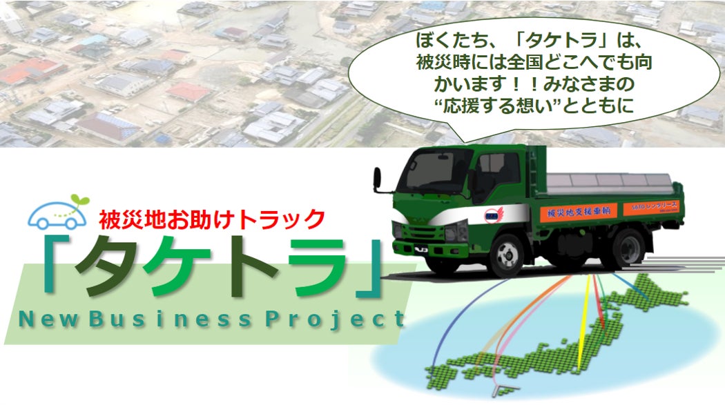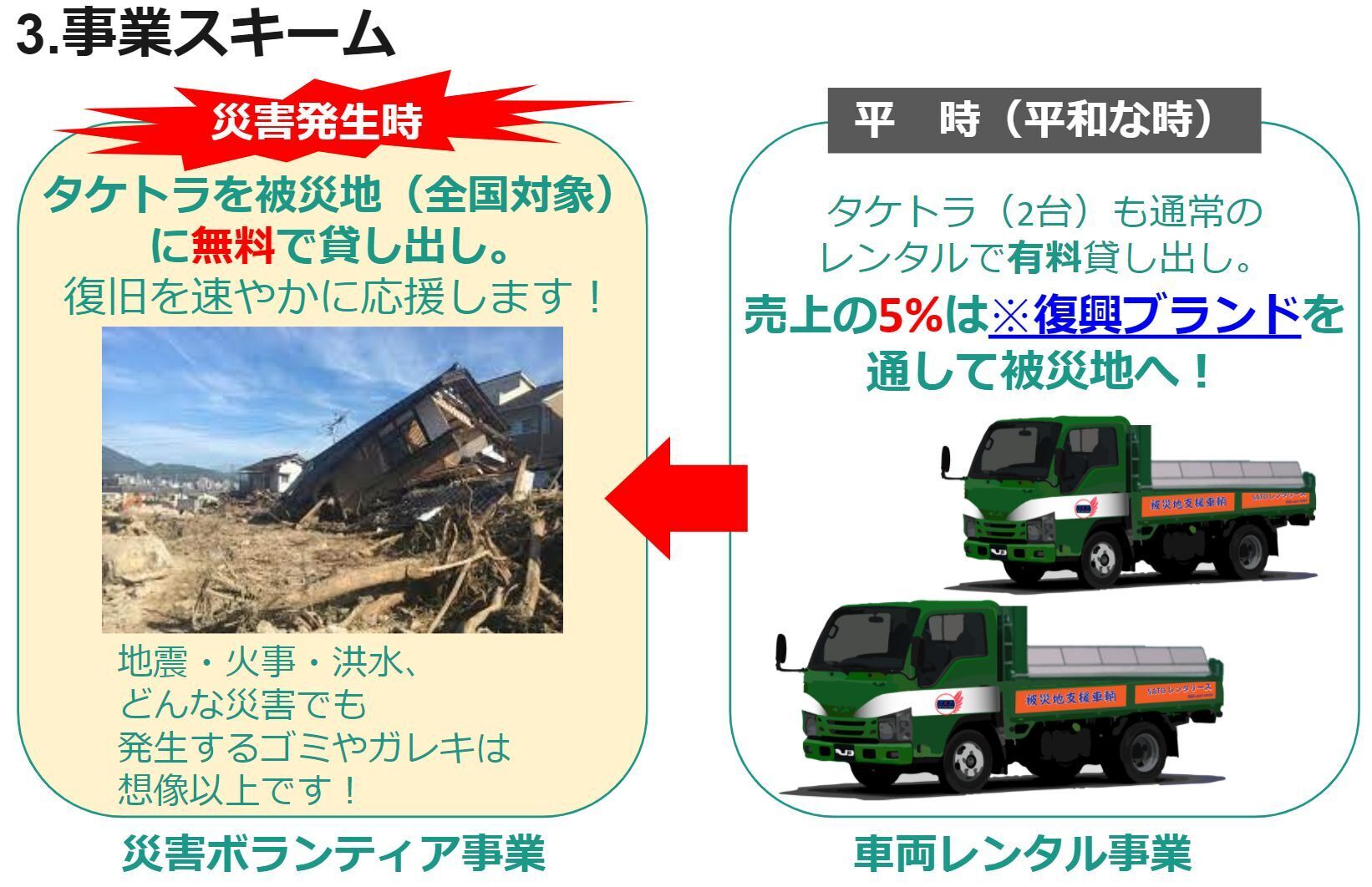 そこで、本プロジェクトを通じて、トラックやダンプカーなどの工事用車両のレンタル事業を『新たに立ち上げる』とともに、被災地支援用トラックである『タケトラ』を製作し、全国各地の被災地へと無料貸出する体制を構築することです。