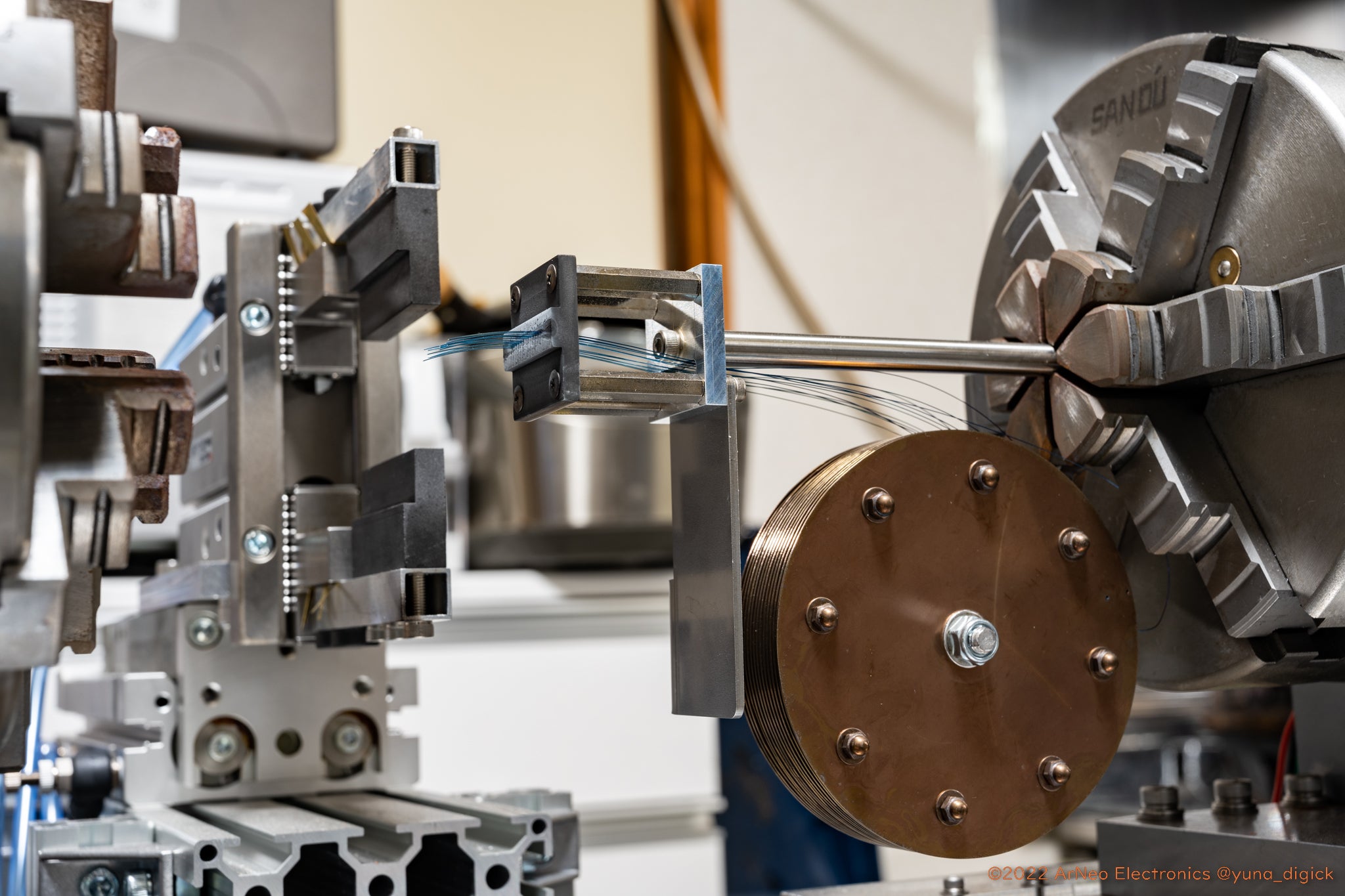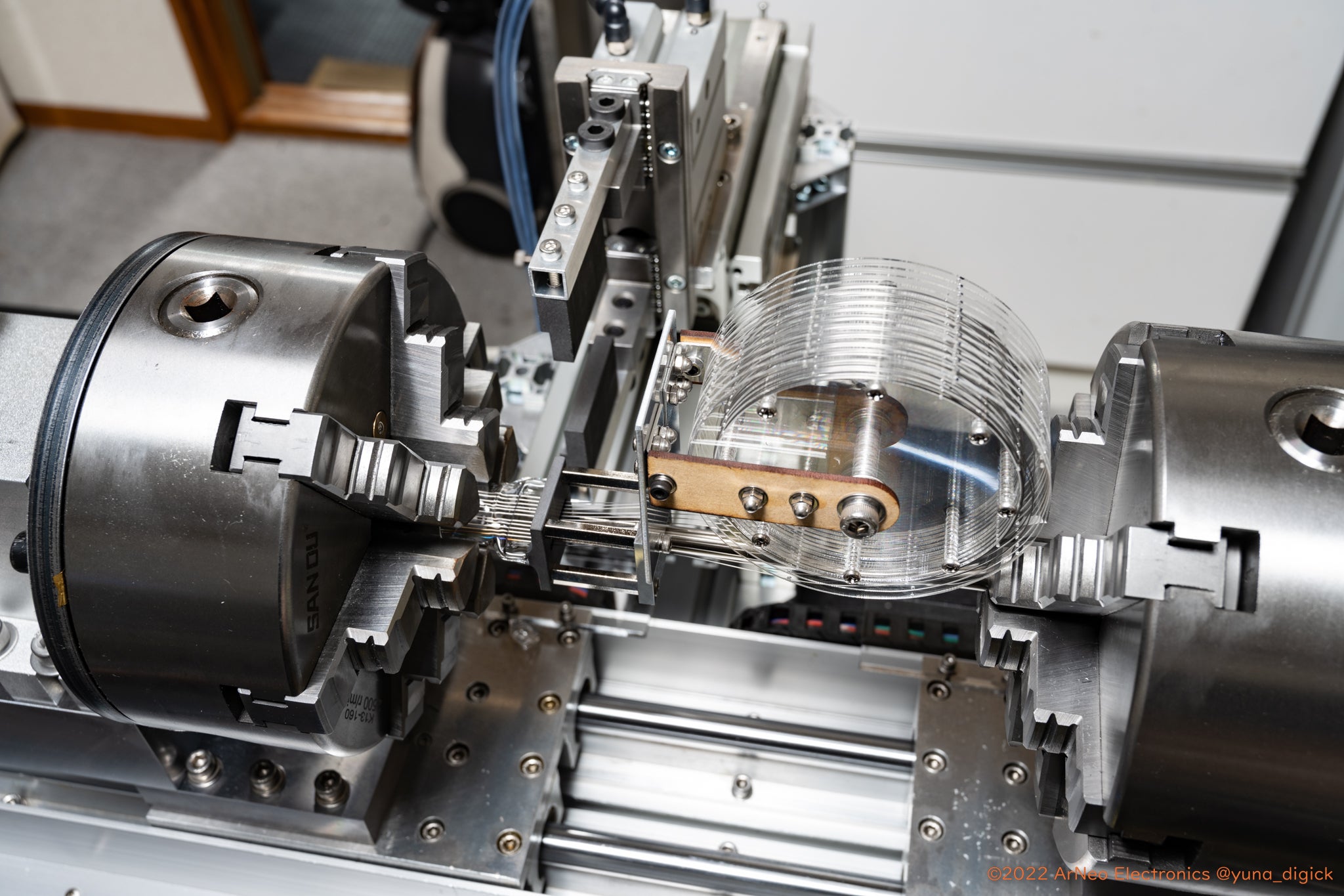 ピンチステムの製造はニキシー管を構成する部品の中で最も難しいガラス加工です。品質を高めるため、半自動化した加工装置の開発と改良に多くの時間を費やしています。2020年頃の試作では1日かけて10個程度しか作ることができませんでしたが、加工装置ができてからは数分で1個作れるまでに生産性が向上しました。