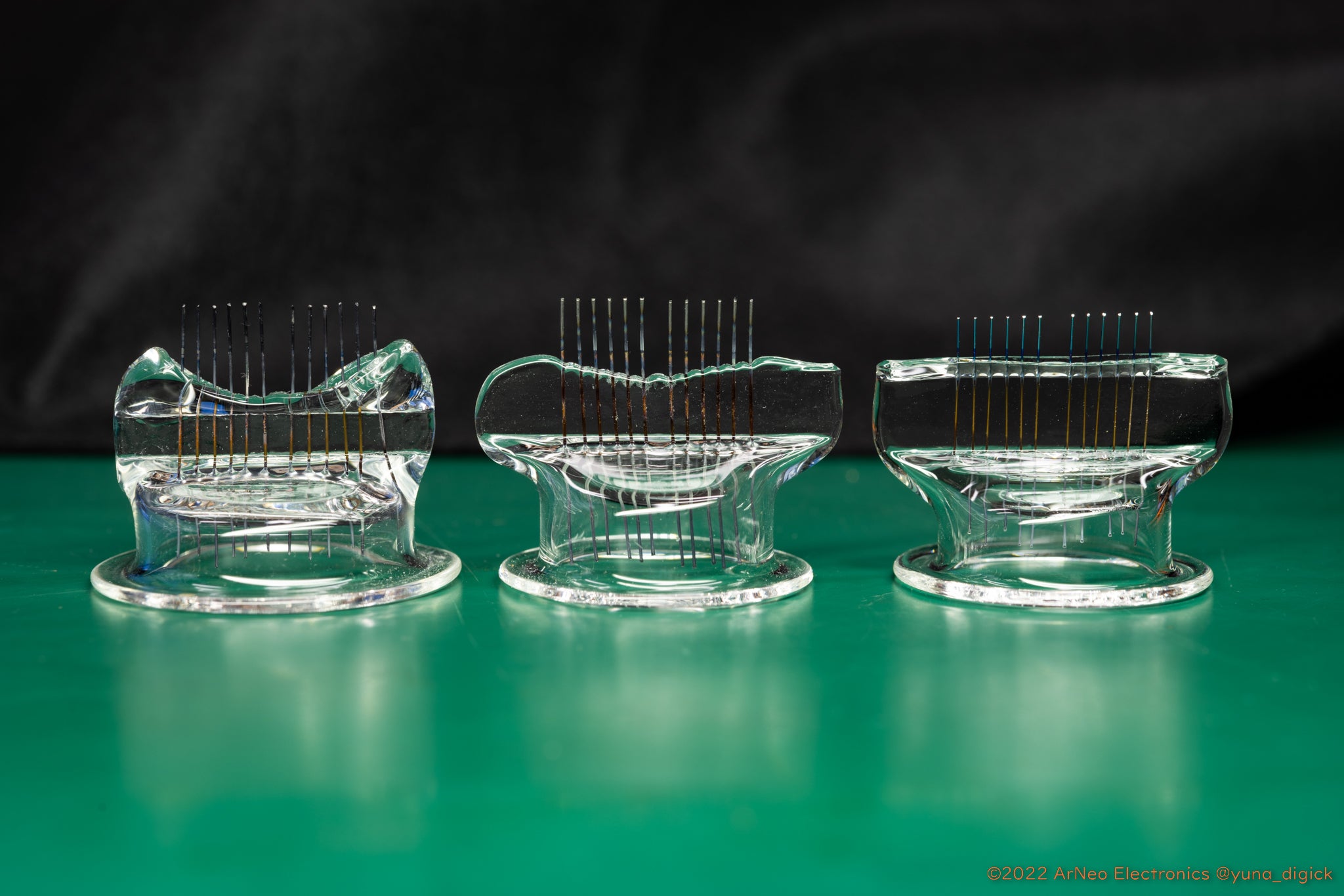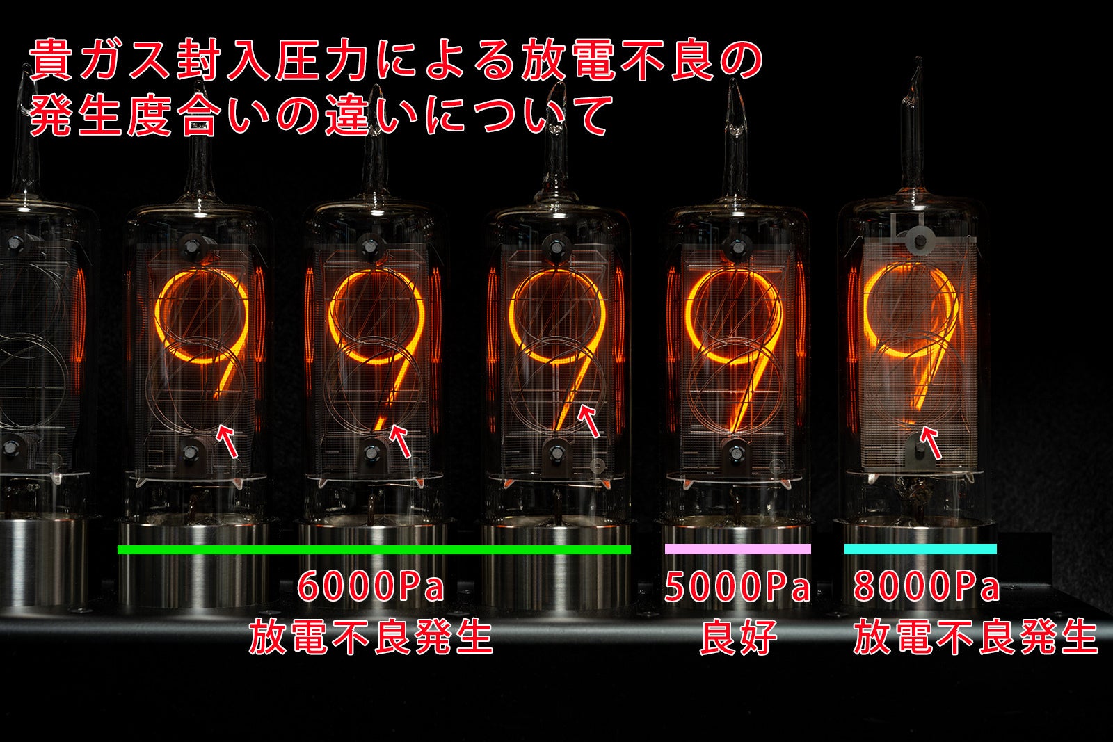 ニキシー管の外と内とをタングステン線でつなぐピンチステムから外気が侵入(リーク)することで点灯不良が発生する問題です。ニキシー管を作る上で最も難しい加工になりますが、この部品さえ問題がなければ非常に長い寿命が見込めます。材料の前処理や加工装置を繰り返し改良していくことで解決の目処は立っています。