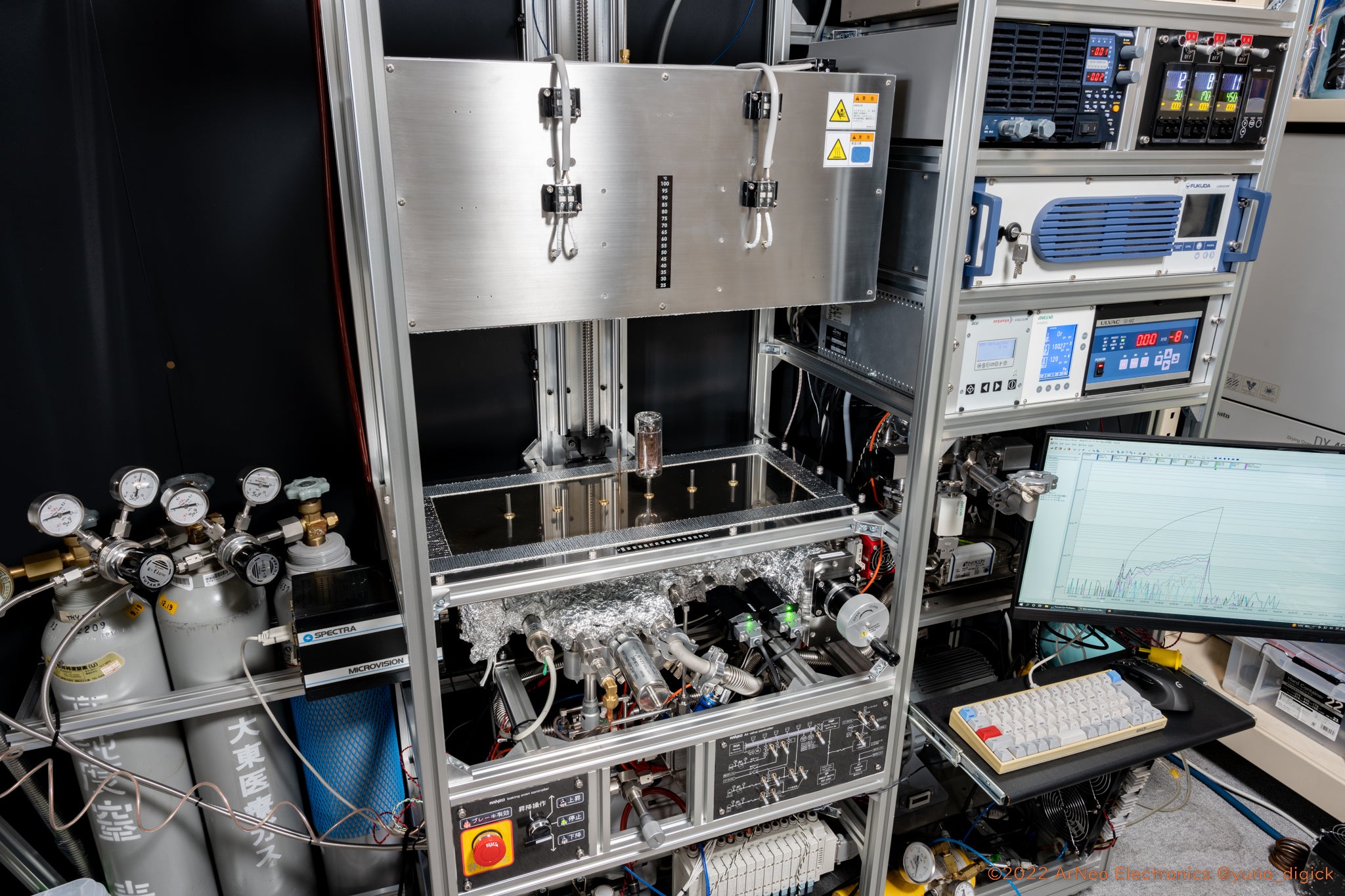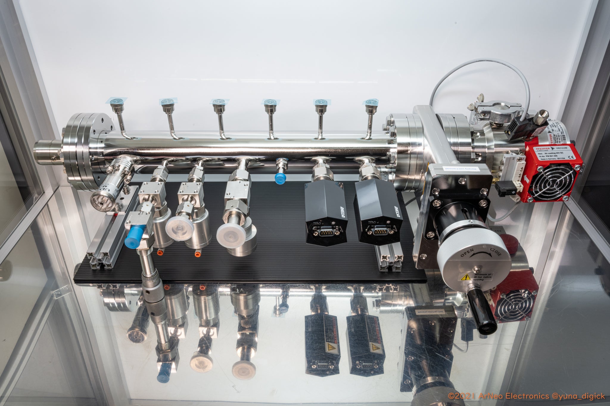 ニキシー管を製造するにあたり、真空引きと貴ガスの導入を行う装置はほぼ完成しました。現時点で製造に必要な全ての機能の開発を終え、量産に使用可能です。さらにバルブ開閉の自動化など行う予定でいますが、必要不可欠ではないため将来の目標としています。プロジェクトのほとんどの資金はこの装置につぎ込まれています。従来の真空装置よりも非常に高い真空度を達成できたこと、極めてクリーンで精密な圧力の貴ガスを制御できるようになったこと、6本同時に加熱処理できるようになったことなど、ご支援があったからこそ実現できたことばかりです。
