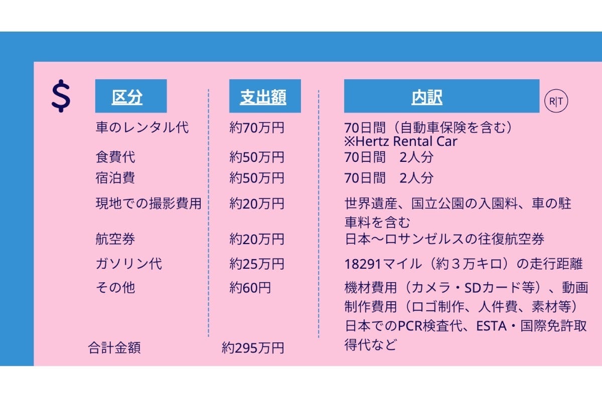 現地での撮影にかかる費用(70日分)(世界遺産、国立公園の入園料、車の駐車料等を含む):約20万円