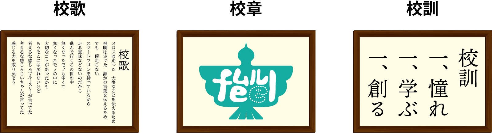 ムルフィールの文字をあしらった鳥を校章としました。島にはたくさんの渡り鳥が毎年同じ周期で戻ってきます。この鳥のように大空を羽ばたき俯瞰する力が持てるよう思いを込めました。