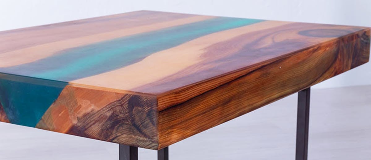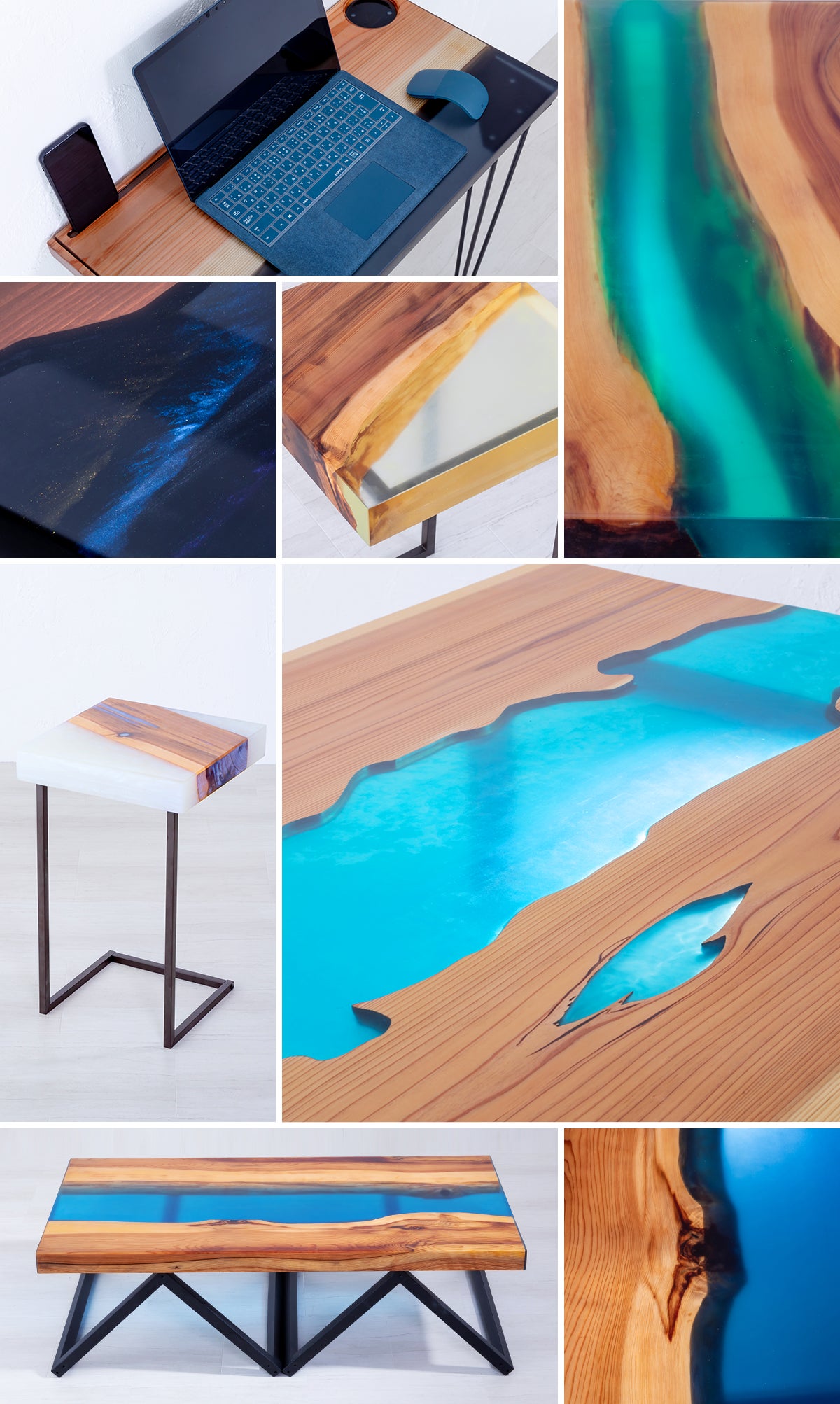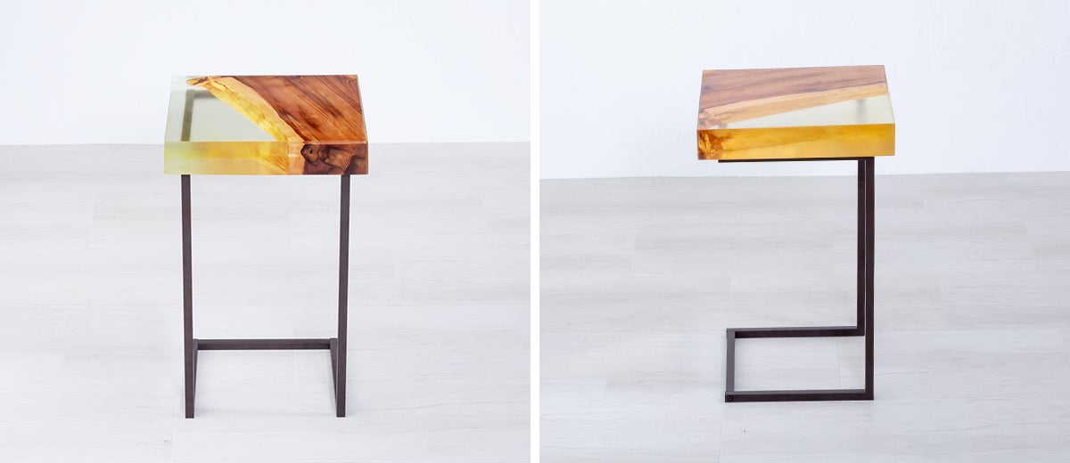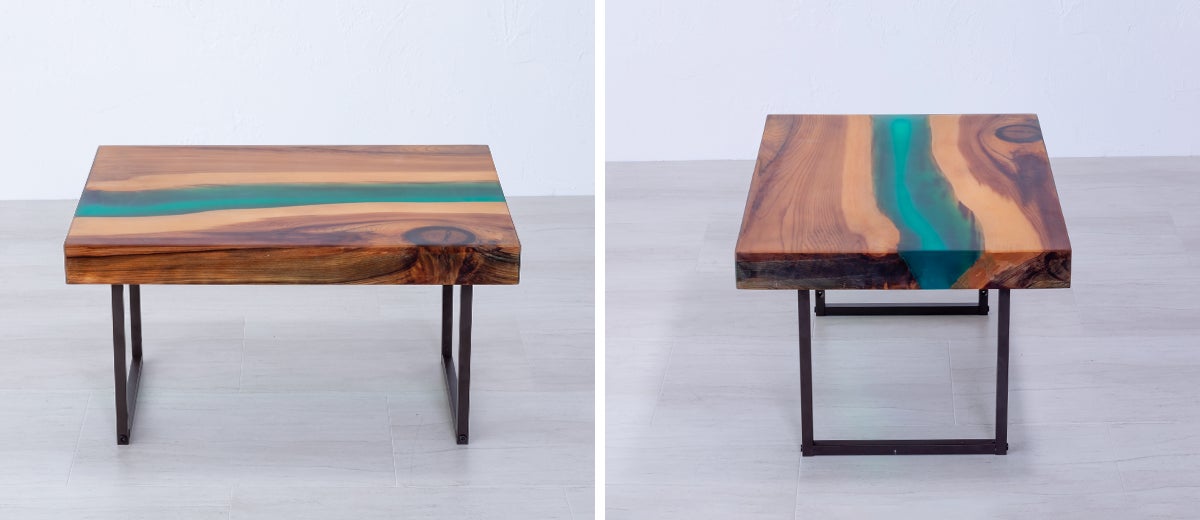 エポキシ樹脂は、アクリル等の樹脂に比べ耐熱や耐衝撃にも優れ家具に適しており、また見た目においても無垢材と調和し今までに見たことのない新しい家具になります。