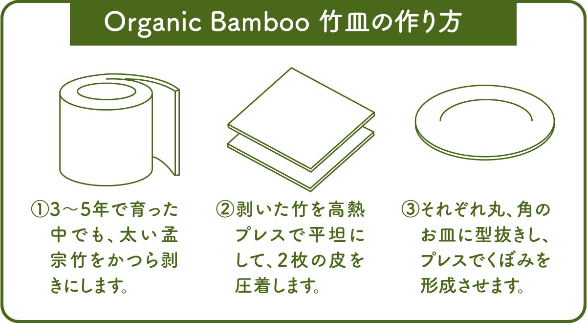 本製品は、防カビ剤などの薬剤を一切使用せずに長期保存を可能にした当社独自の技術を採用することで、料理を美味しく食べていただける竹食器を実現しました。また、色合いを均一にするために一般的に用いられる漂白剤も一切使用しておりませんので、季節で変わる竹本来の色合いや自然な竹の香りをお楽しみいただけます。