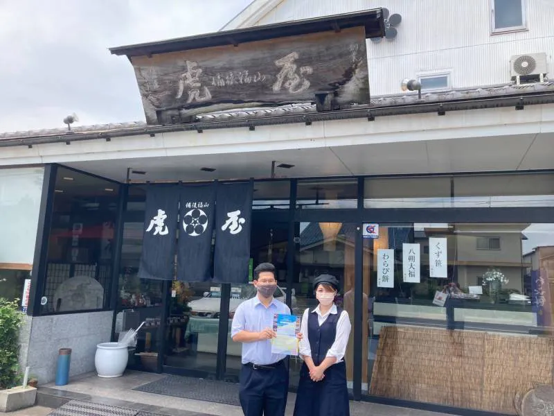 福山で400年の歴史を紡ぐ虎屋本舗様の各お店に、クラウドファンディングの告知チラシを貼らせていただきました。