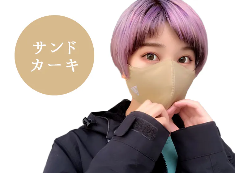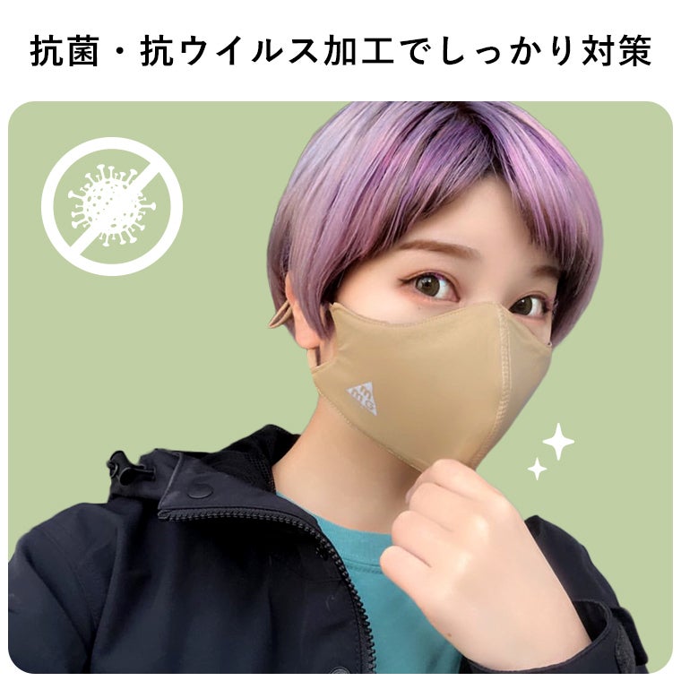 アウトドアライフを快適に過ごすために超撥水・防水機能にさらに抗菌・抗ウイルス加工も施しました。水をはじいて汚れもつきにくいのでアウトドアにぴったり。ストレッチ性のある素材を使用し、優しくフェイスラインにフィットします。