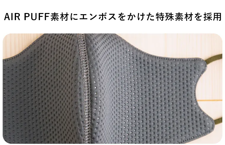 マスクの内側には、空気の層を含む弊社のオリジナル素材「AIR PUFF」を採用。それに加え、独自のエンボス加工により肌への接触面を減らし、軽くて快適なのにしっかりとした着け心地を実現。スマートな外観をキープしてくれます。お洗濯などのメンテナンス性も高く、デイリーにご使用頂けます。