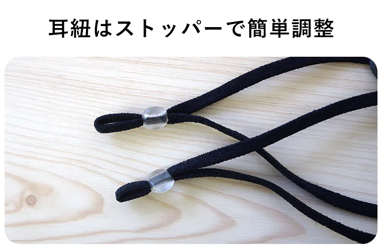 耳紐のゴムの長さはシリコンゴムの優しいストッパーで調整が可能です。透明なシリコンゴムなので、目立たずピッタリの長さに調整できます。