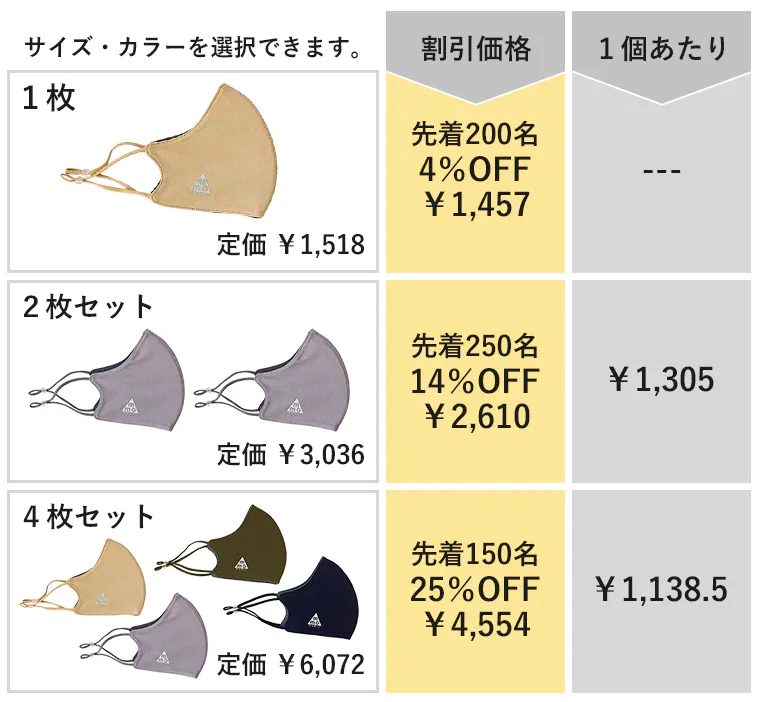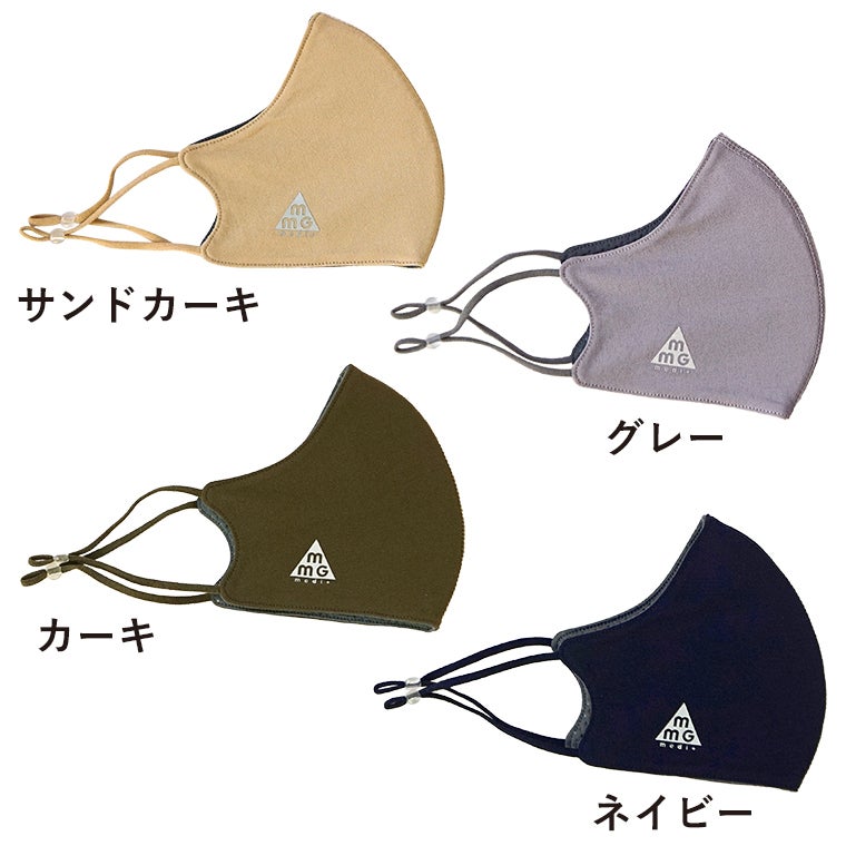 4色のアウトドアを意識した豊富なカラー展開をご用意。耳紐をマスク本体と同じ色に染め上げ、おしゃれに仕上げました。ストッパーのシリコンゴムは透明なものを使用しているので目立たずに馴染みます。