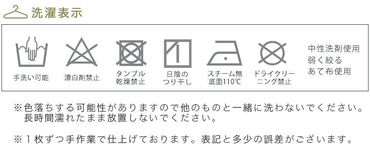 注意事項:1枚ずつ手作業で仕上げておりますので、同じサイズでも多少の誤差がある場合がございます。/個人差により眼鏡が曇る場合がありますので、運転等の際は十分にご注意ください。/本品は有害な粉塵やガス等が発生する場所やそれを防ぐ目的でのご使用はできません。/万が一、かゆみ・かぶれ・発疹などが生じた場合はただちにご使用をやめ、医師にご相談ください。/乳幼児の手の届かない所に保存してください。/湿気のない清潔な場所に保管してください。/火気のそばでのご使用はおやめください。/長くお使いいただくために手洗い・形を整えて吊るし干しを推奨しております。/敏感肌の方はご使用前に水通ししてからご利用ください。/商品によってウイルス感染を防ぐものではありません。商品に付着した菌を抗菌・抗ウイルス化する商品です。