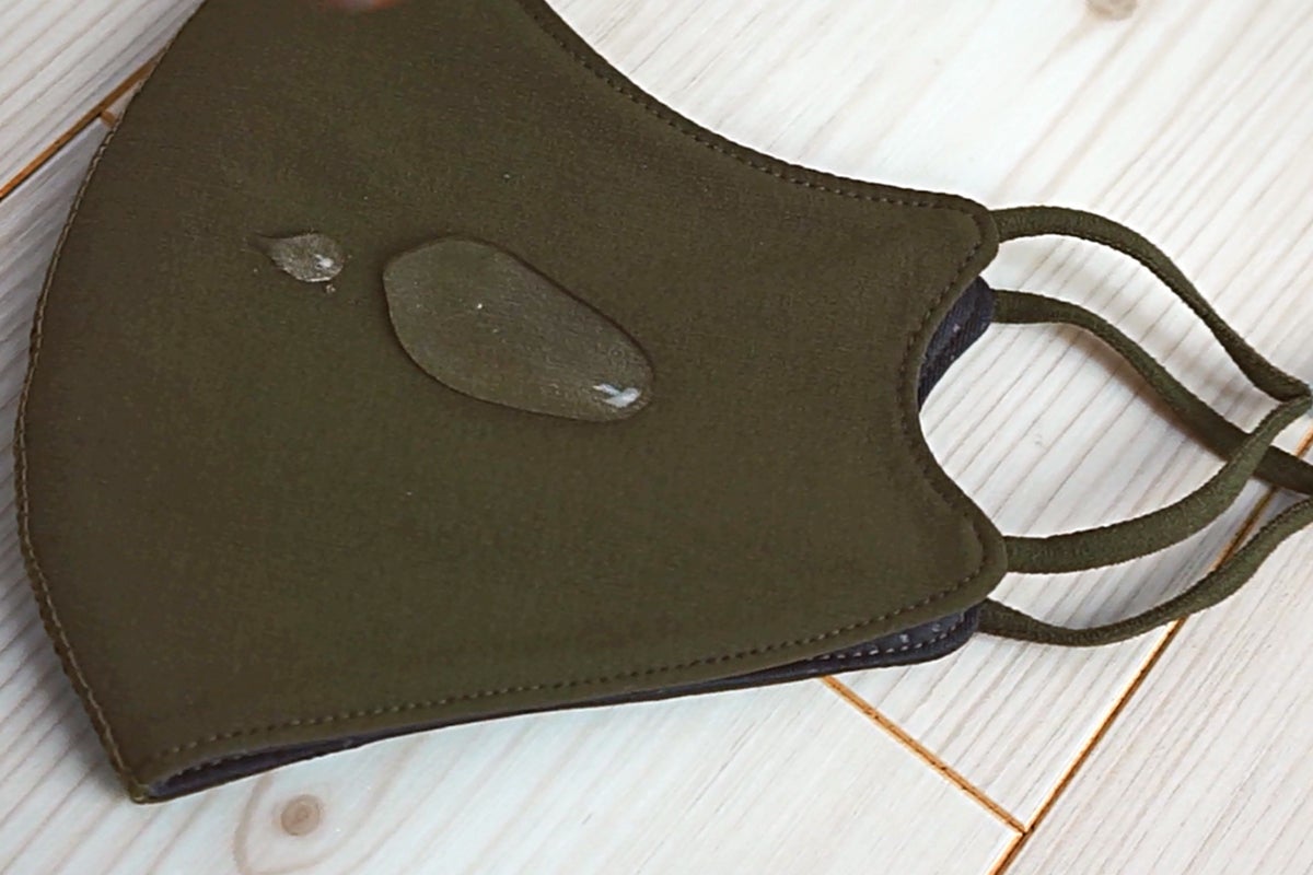 表面には、ストレッチ織物にメンブレン加工した防水素材を使用しています。超撥水加工が水分をしっかりと弾いて汚れにくい、撥水・防水マスクです。