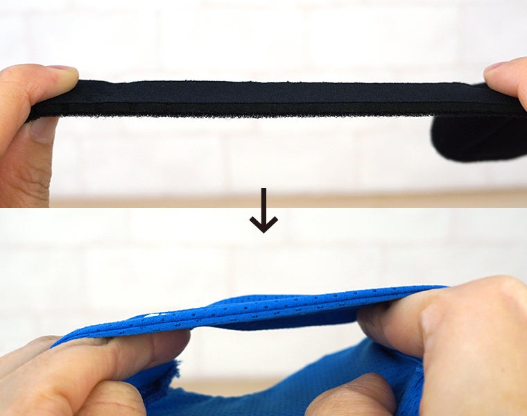第一弾はしっかりとした厚手の生地を使用していました。耐久性には優れていますが、暑い中での装着は汗ばんでしまうとのご意見もいただきました。