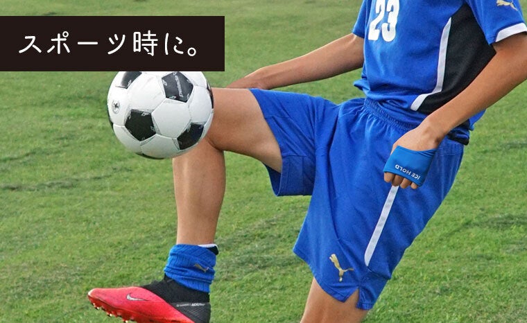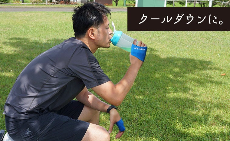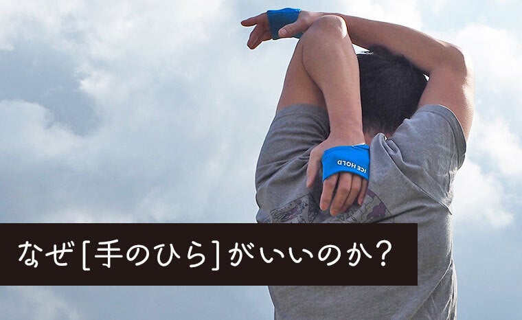 その状態で「ICE HOLDてのひら冷却サポーター」を着用し、手を冷やすことにより、流れ込む暖かい血液を効率的に冷却します。冷たい血液を循環させることで深部体温を下げる暑さ対策グッズです。