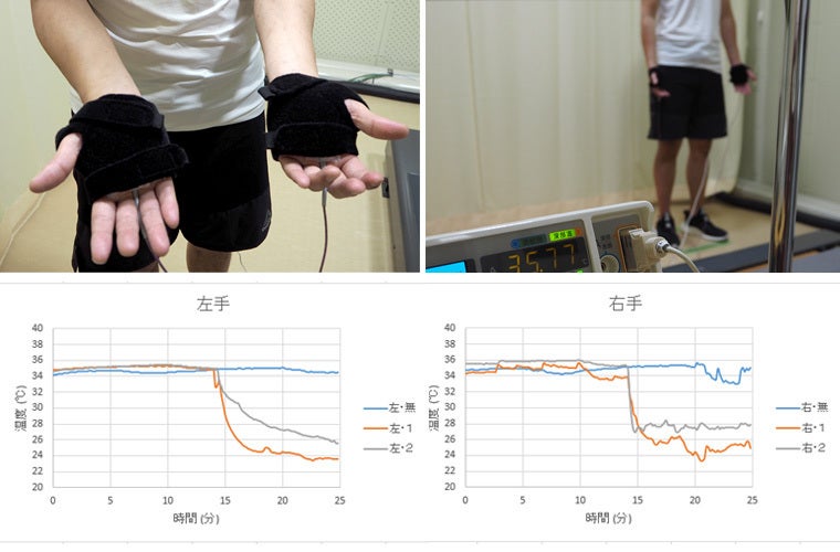 手のひらの表面温度のモニタリングでは、サポーターをつけた10分間は冷えすぎることなく23-25℃を維持することができました。運動後の表面温度より約10度低い状態を、快適な使用感で使うことができました。サポーター・保冷剤により手のひらを効率的に冷やすことができたといえます。
