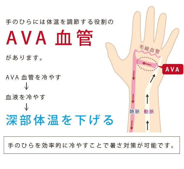 手のひらには冷えた血液を全身に循環させる「AVA」と呼ばれる特別な血管があります。動脈と静脈をつなぐバイパスのようなもので、普段は閉じていますが、暑さや運動などで体温が上がる際に、閉じていたAVAが一斉に開通し、ここに大量の血液が流れ込むようになります。