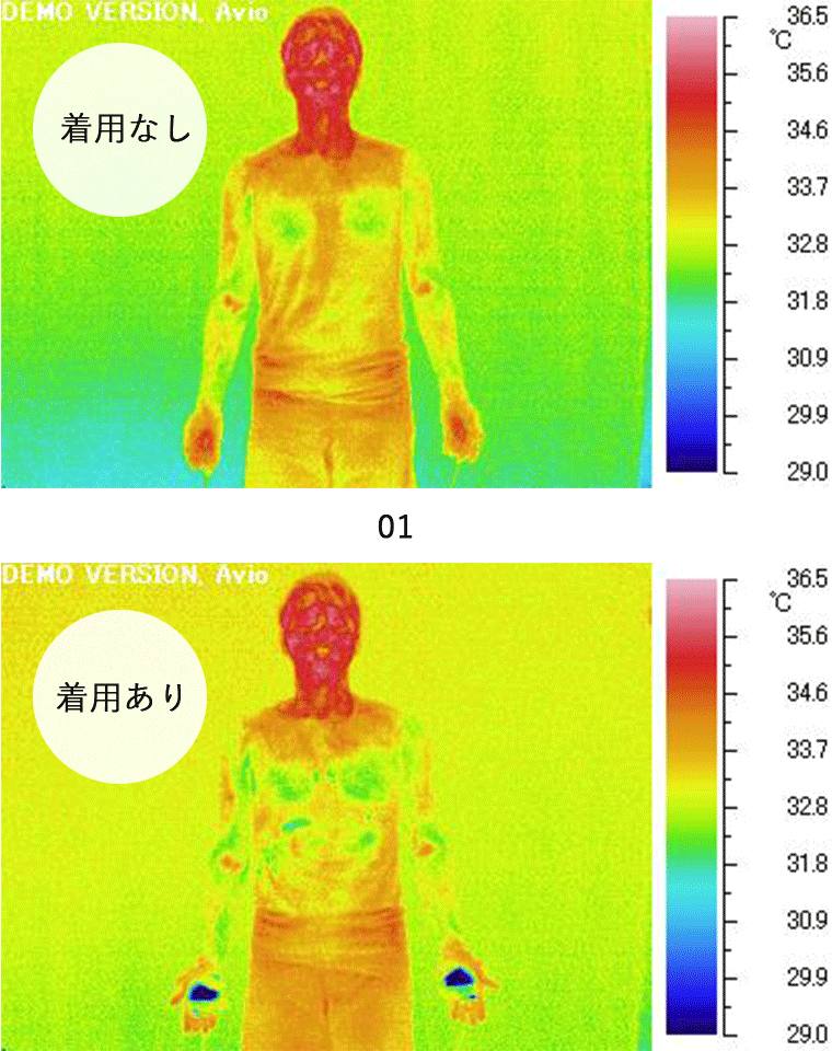サーモグラフィ撮影では、運動後10秒間に1回の撮影を10分間連続して撮影しました。着用なしの場合は体温が徐々に上がり体温が再度下がるまでに時間がかかりました。サポーター着用の場合は、着用後すぐに腕の血管を中心に体温を下がる様子が確認できました。