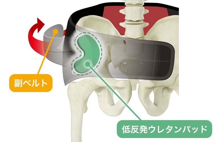 *骨盤後方への引っ張りが弱いと感じた場合は、主ベルトを固定し直すか、ウレタンパッドの位置を調節し、骨盤前方にしっかりかかるように調節します。