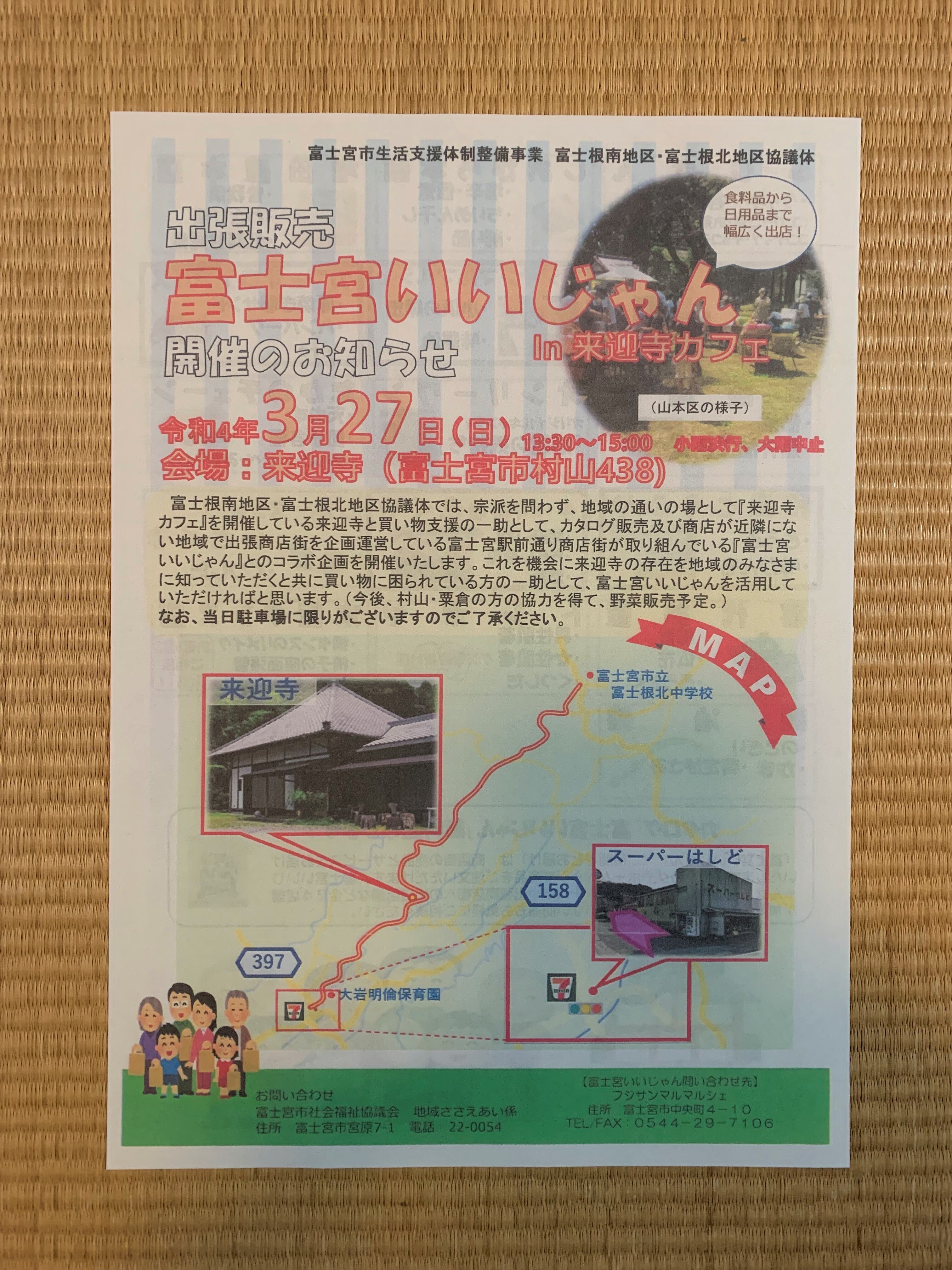 「富士宮市に地域のみんなが集まるお寺カフェを作りたい!」2021年5月6日にプロジェクトを立ち上げ、ご縁をいただいた皆様のご理解とご協力、またご支援のおかけで活動を発展(産学官民寺)させることができ、このたび、富士宮市ボランティア連絡会と富士宮市社会福祉協議会主催の~ボランティアまつり~ふれあいトークにおいて、大正大学社会共生学部公共政策学科 専任講師 髙瀨顕功氏と一緒に下記の内容で講演会を開催する運びとなりました。たくさんの皆様にお越しいただけますと幸いです。・髙瀨先生 地域共生社会とは、社会参加の場はなぜ必要か?、地域資源としての寺院(介護者カフェ等)・岩田 来迎寺カフェの経緯・活動、活動を通じて気づいたことや感じたこと、地域寺院活動の展望等12月18日(日)13:30~15:00 出張商店街in来迎寺カフェ(富士宮市生活支援体制整備事業 富士根南地区・富士根北地区協議体)を開催します!皆様のご来場お持ちしております。富士宮社会福祉協議会 地域ささえあい係・富士宮市役所 企画戦略課 地域政策推進課来迎寺カフェ 代表 岩田照賢 富士宮市村山438 0544-23-9755