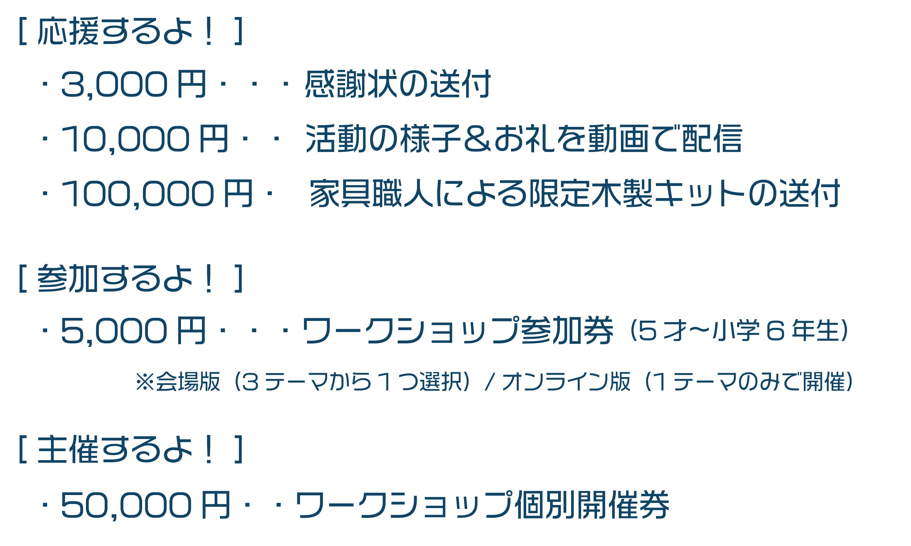 また、50万円以上ご支援頂けた場合は、開催会場レンタル代・備品購入などワークショップ運営費として大切に使わせて頂きます。