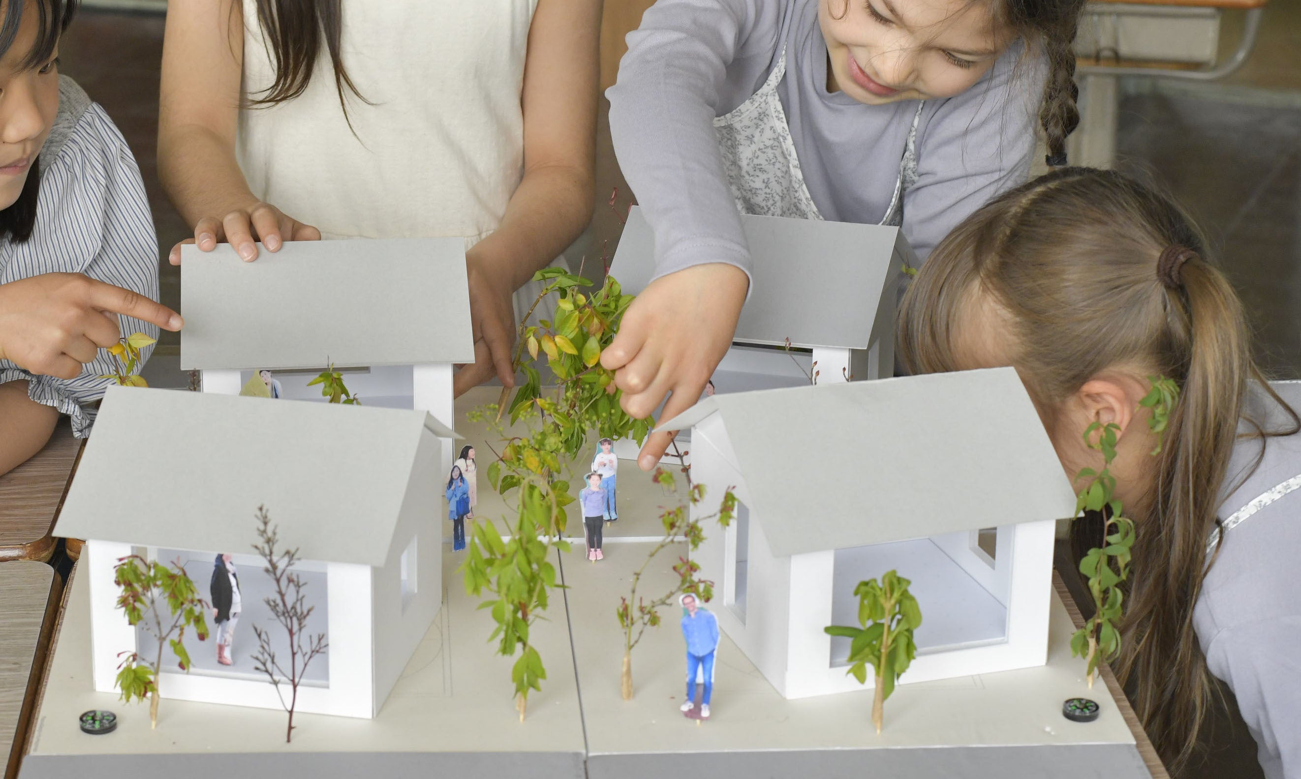 キットを組み立て「自分だけの家」をつくっていきます。色を塗ったり、家具・人型・樹木をつくります。普段は見えない断熱材に触れたり、気密、窓、屋根・軒のことを知っていきます。