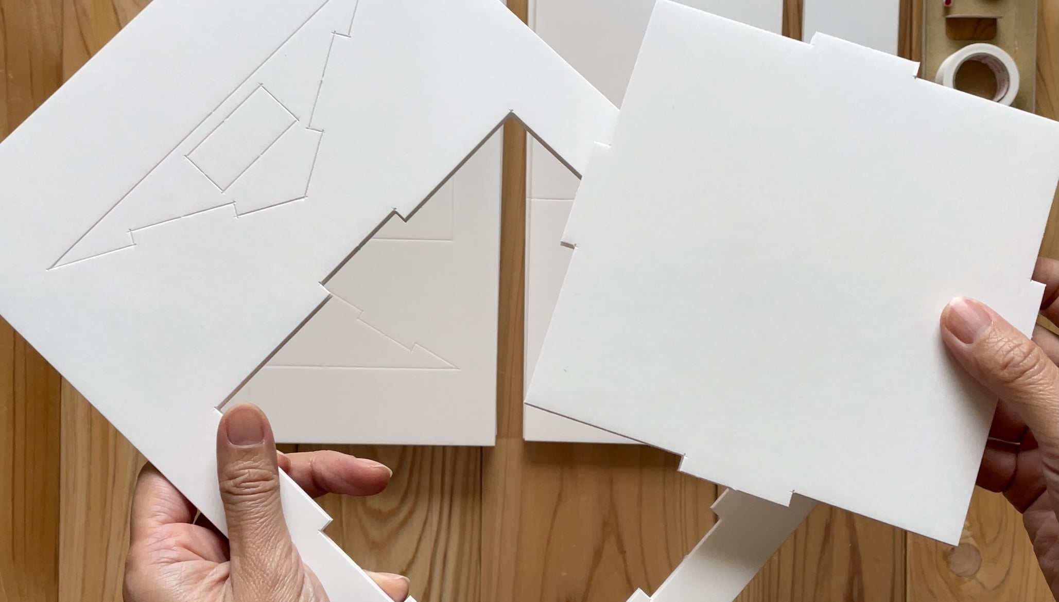 この動画のパーツは発注先である福永紙工さんから、機械でつくられた第一号試作品です。