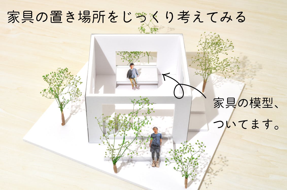 家づくりキットには、家と人の模型の他に、家具や花壇をつくれるようにしています。